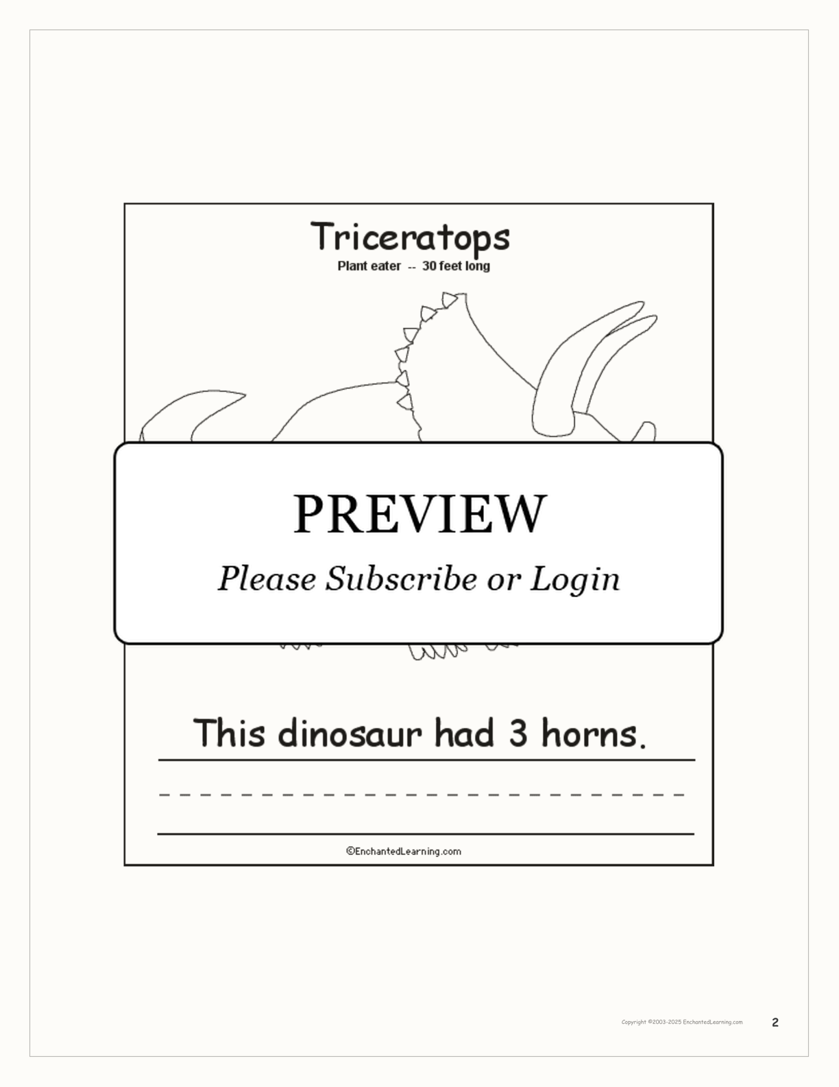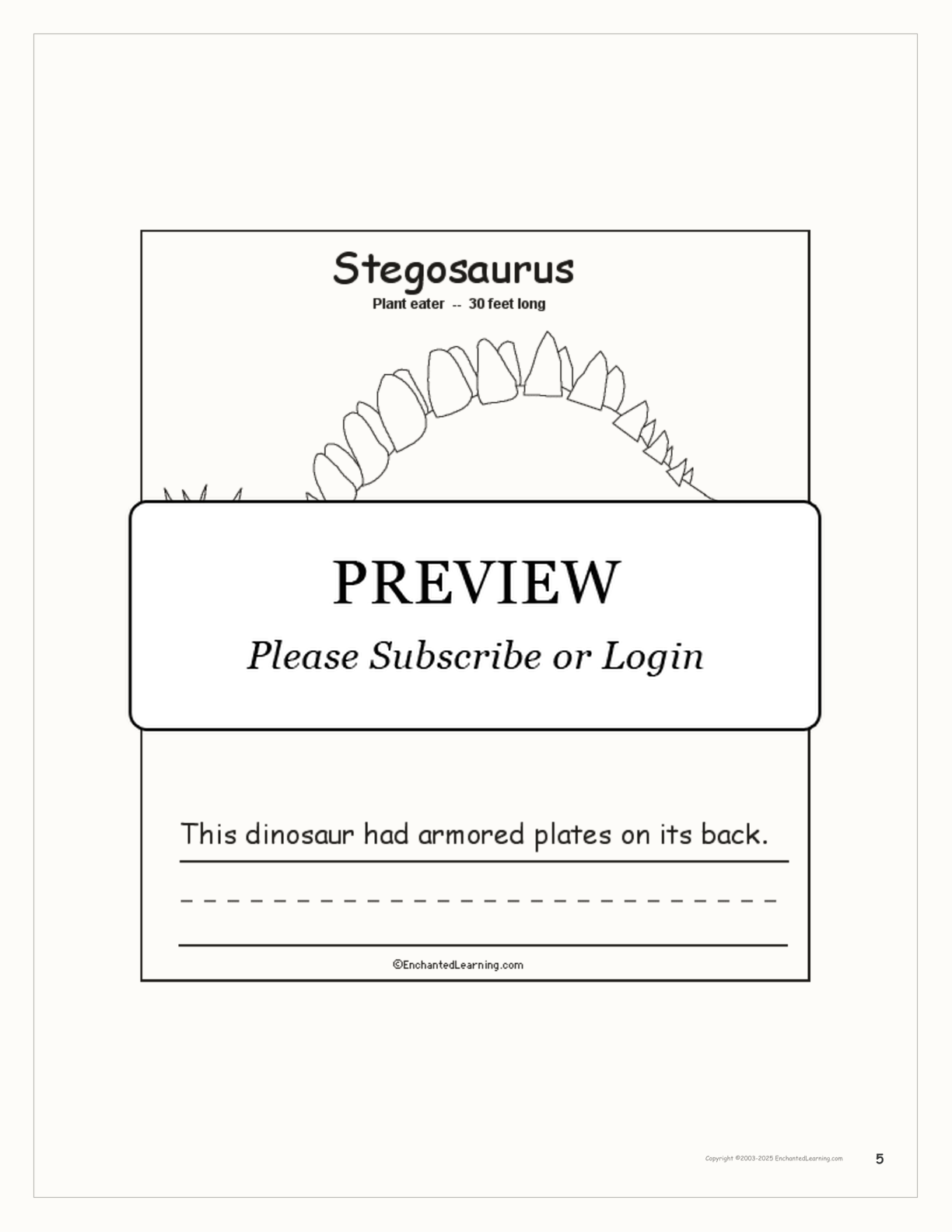 This is a short, printable book about dinosaurs for early readers. The book has pages for the student to cut out, read, color and short phrases to copy. The dinosaurs include: Triceratops, T. rex, Velociraptor, Stegosaurus, Compsognathus, Pachycephalosaurus, and Apatosaurus.