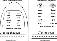 Hair, Eyes De quelle couleur sont tes cheveux? I have __ hair -- J'ai les cheveux ___. (Match the hair shades in English and French.) De quelle couleur sont tes yeux? I have __ eyes -- J'ai les yeux ___. (Match the eye colors in English and French.) |