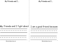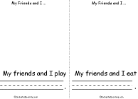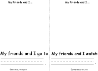 Pages include: My friends (drawing), My friends and I play , My friends and I eat , My friends and I go to , My friends and I watch, My friends and I like to , I like my friends because . My friends and I fight about ___. I am a good friend because __.