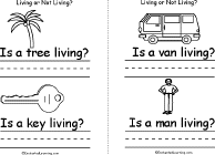 Skills practiced: reading, writing, coloring, determining whether something is living or non-living.
