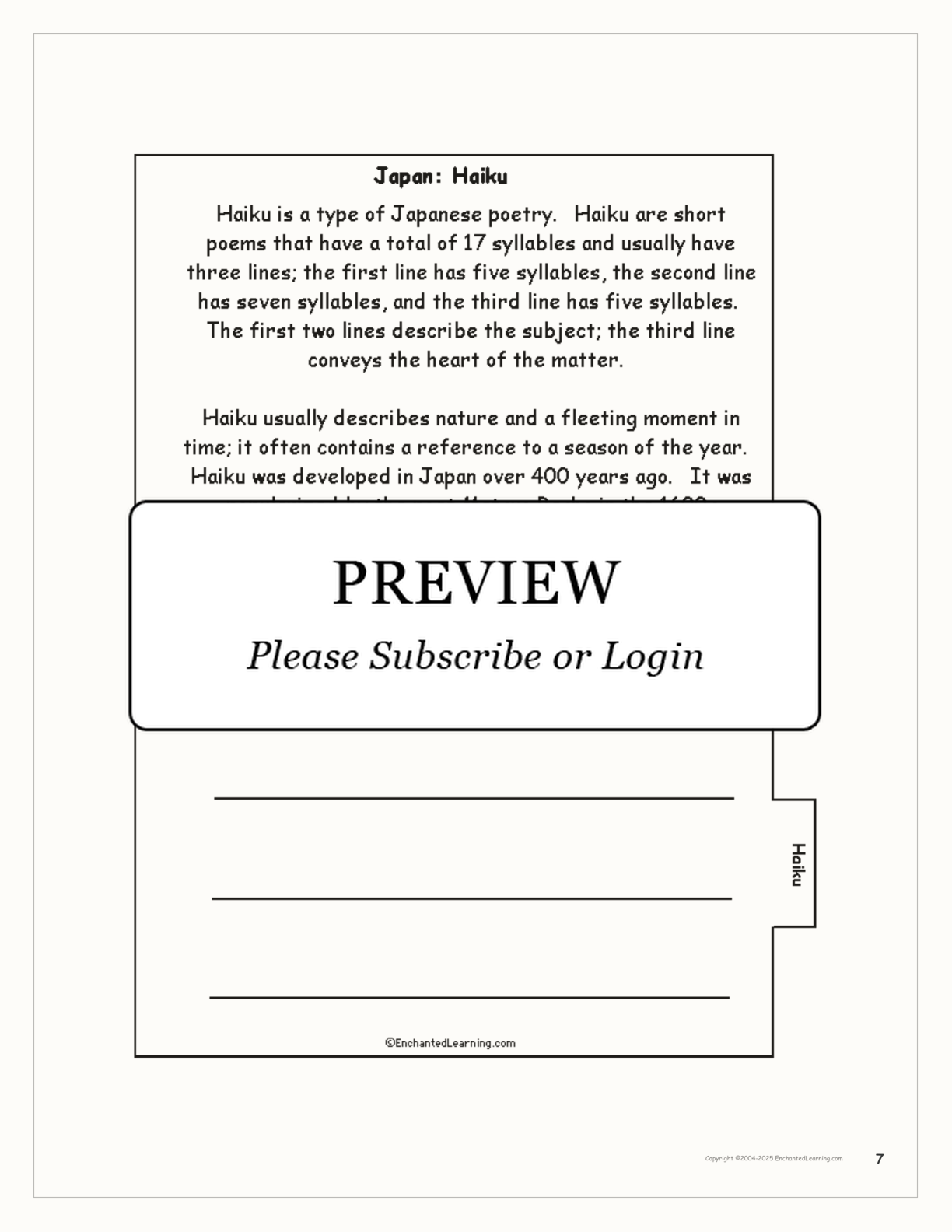 A short, printable book for fluent readers with pages on the Japanese: map, flag, language, origami, haiku, and Mt. Fuji.