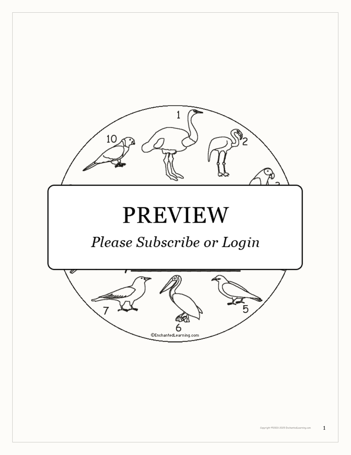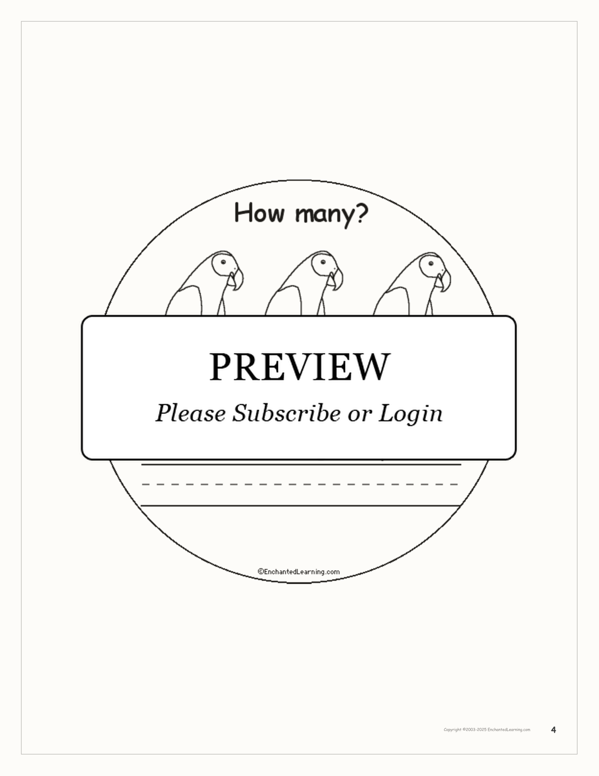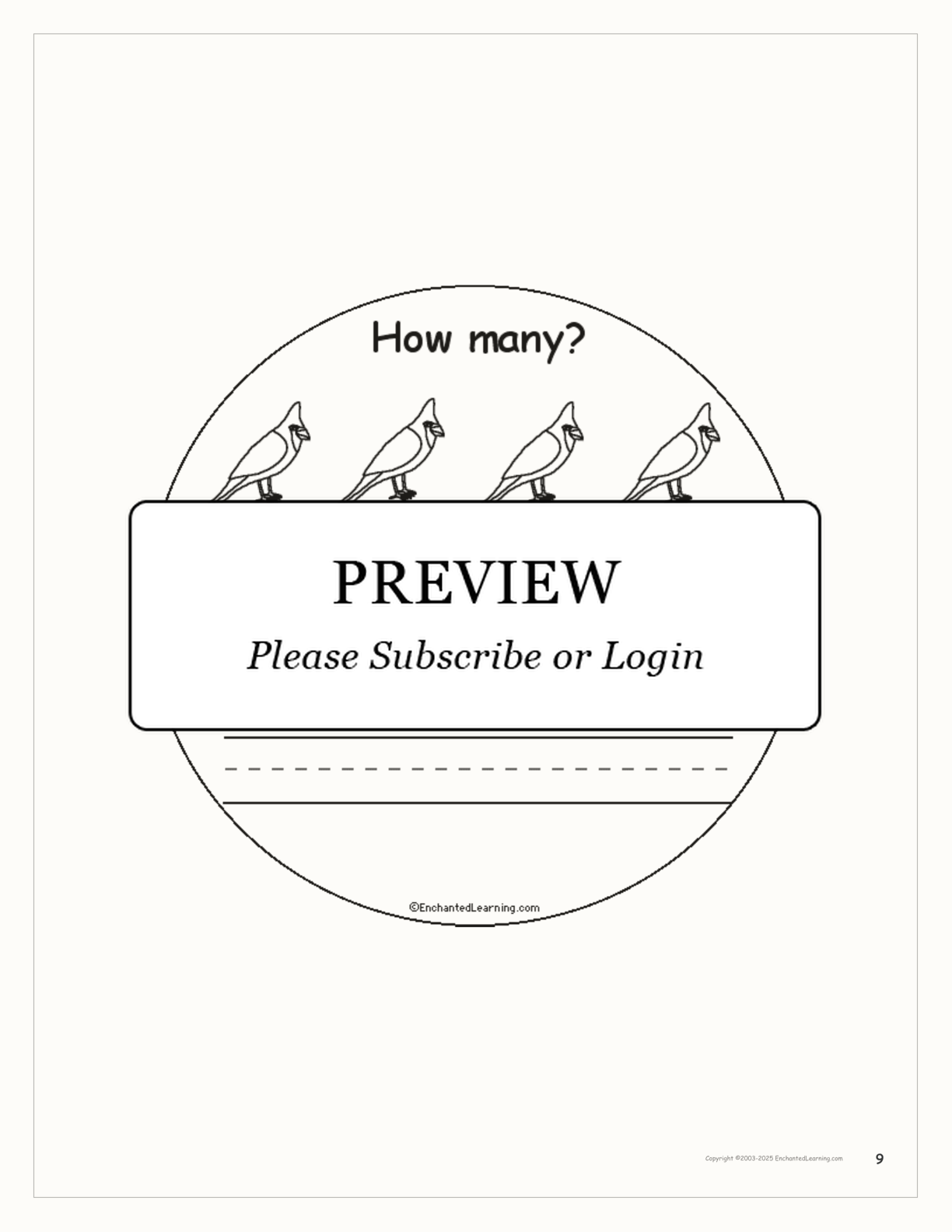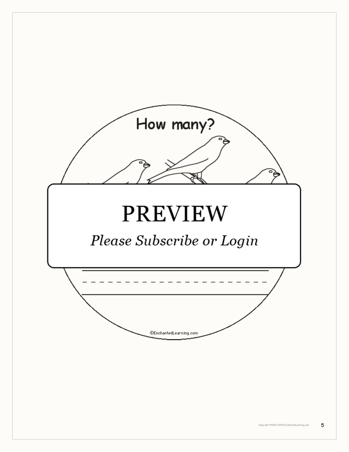 Print this short bird-themed coloring book for early readers, and practice counting and writing.