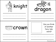 The words are: queen, king, castle, knight, dragon, crown, and “Can you think of another fairy tale word?”