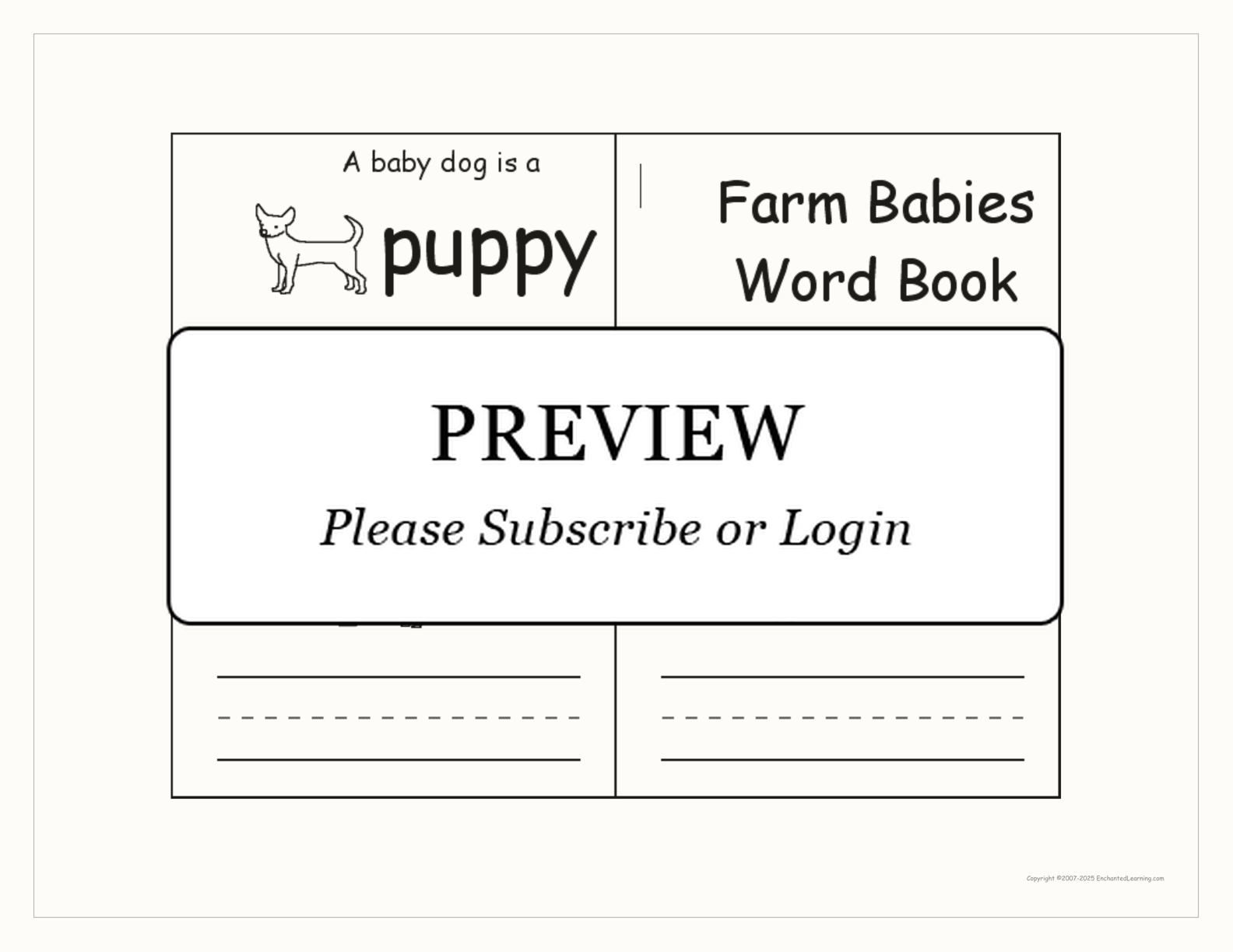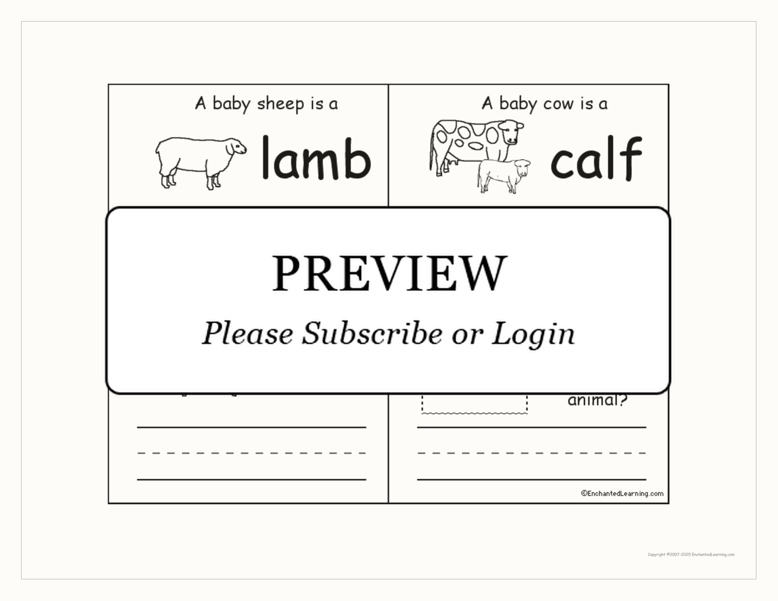 This is a tiny, printable book about simple words related to baby farm animals – for early readers and writers. The book has 2 pages to print and makes 8 pages for the student to cut out, color, and write in. The pages are: “A baby dog is a puppy,” “A baby goat is a kid,” “A baby chicken is a chick,” “A baby sheep is a lamb,” “A baby cow is a calf,” “A baby horse is a foal,” and “Can you think of another baby farm animal?”