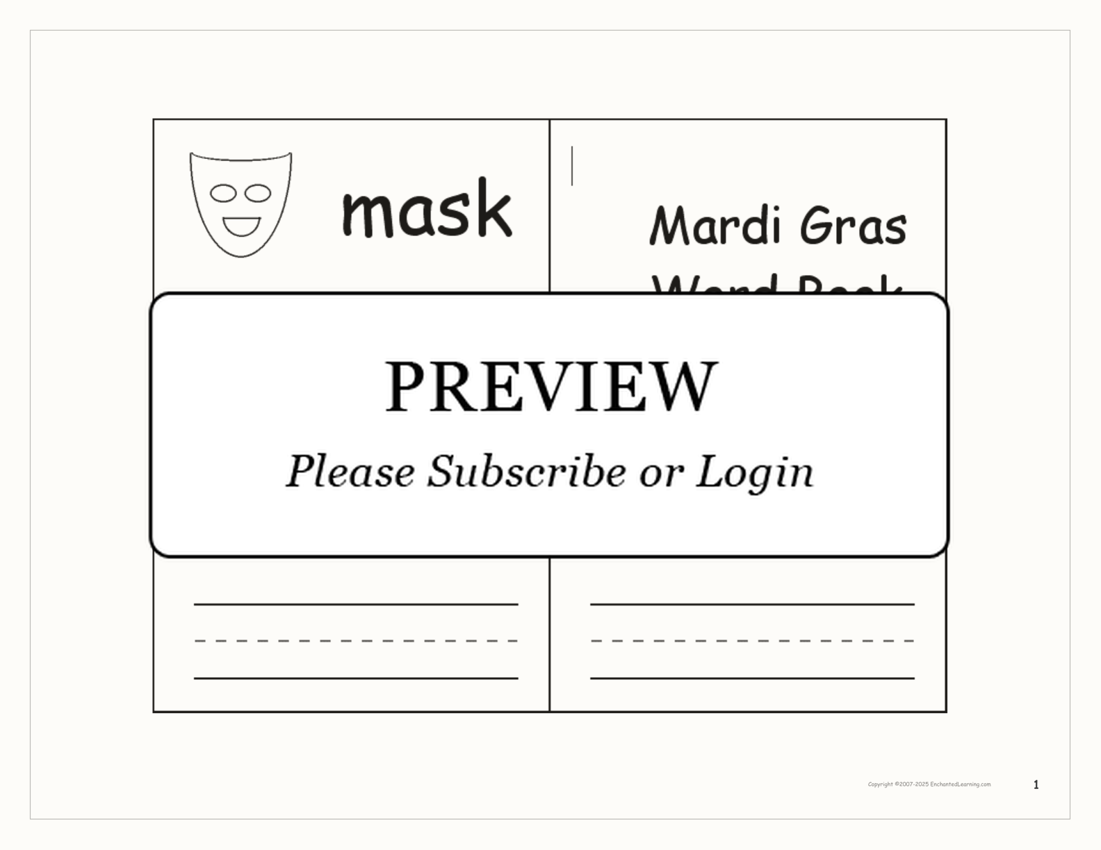 A tiny, printable book about simple words related to Mardi Gras – for early readers and writers. The book has 2 pages to print and makes 8 pages for the student to cut out, color, and write in.