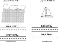 Pages include: Place the rake on the table. Avery baked a cake. The ape ate eight dates. Rain, rain, stay away. Sail away on a lake. Ladybugs stay by the daisy. A clay plate may break.