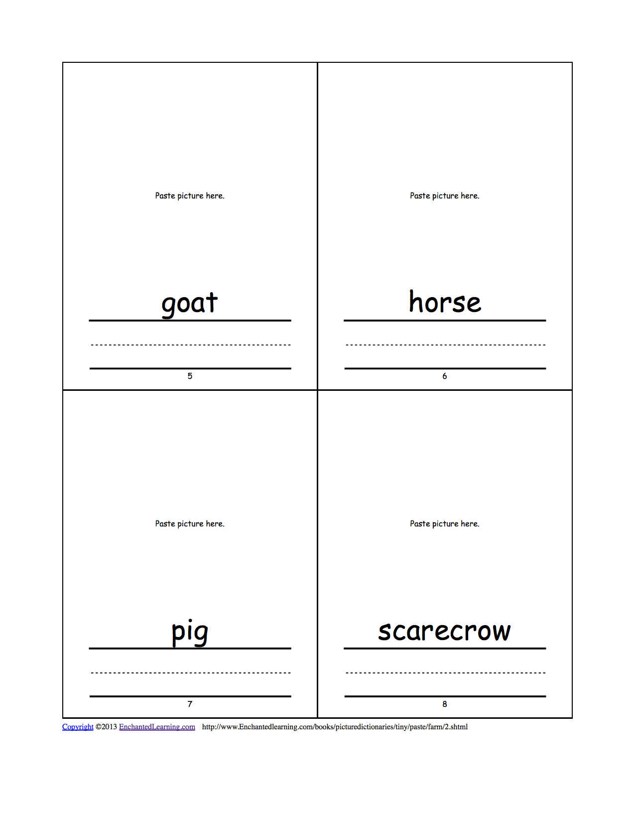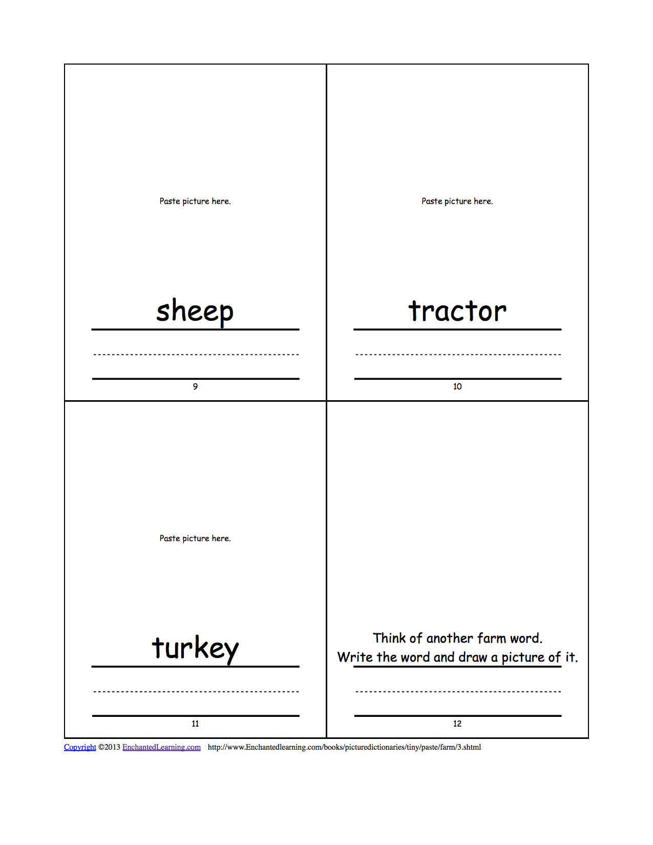 ![]() Pictures to Paste Color the pictures, then cut along the sold lines. Paste each picture on the correct dictionary page. Pictures: chicken, cow, farmer, goat, horse, pig, scarecrow, sheep, tractor, turkey, and write another farm word. |