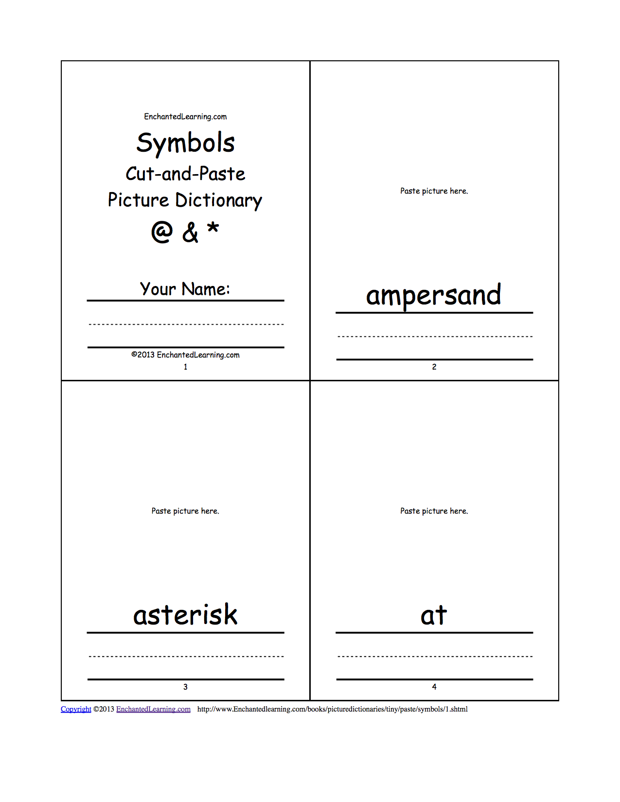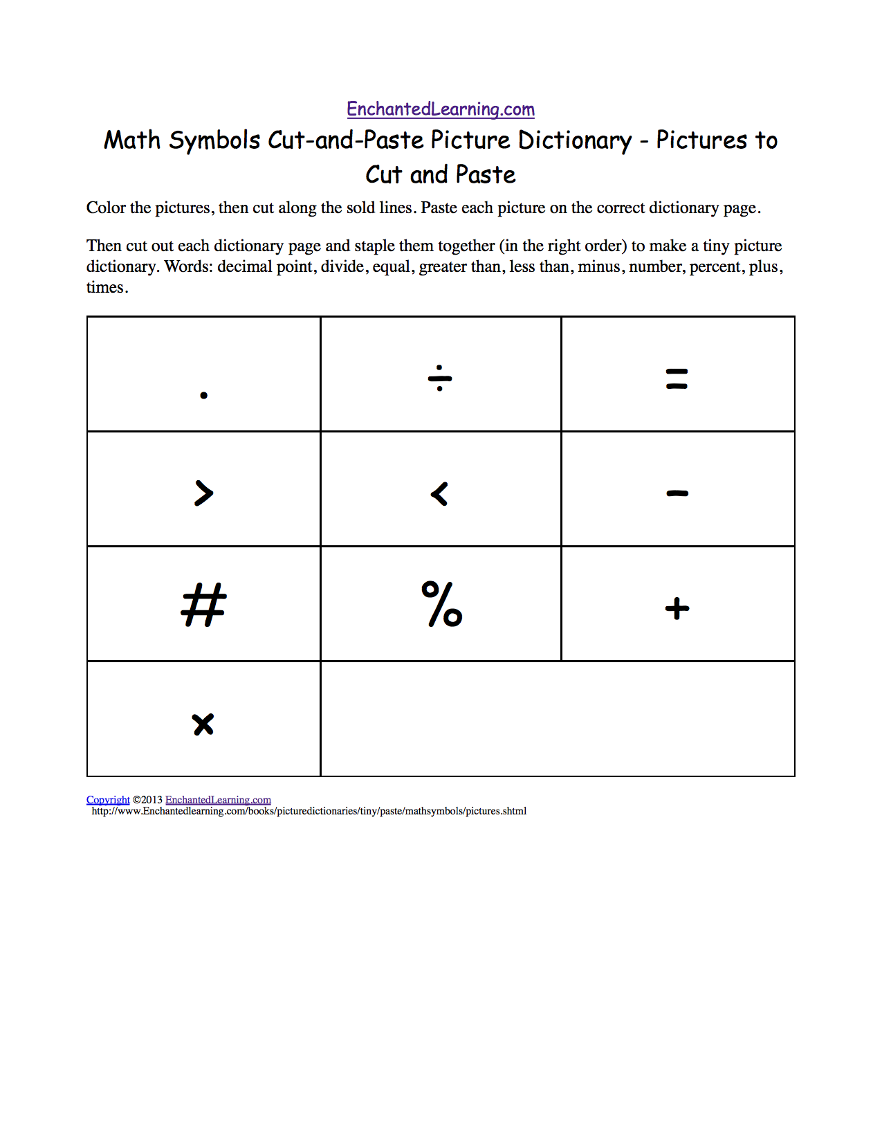 ![]() Pictures to Paste Color the pictures, then cut along the sold lines. Paste each picture on the correct dictionary page. Pictures: decimal point, divide, equal, greater than, less than, minus, number, percent, plus, times, and write another math symbol. |