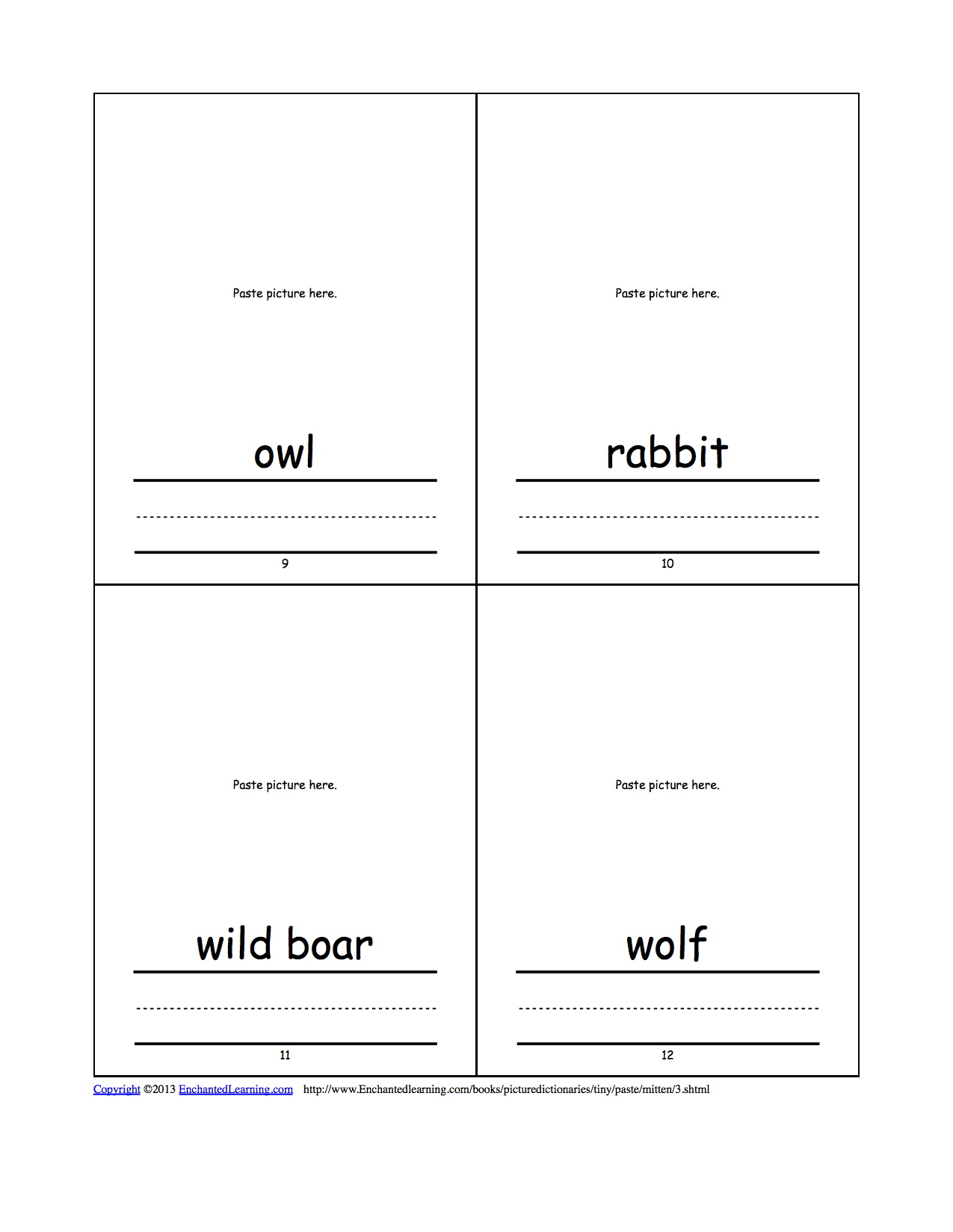 ![]() Pictures to Paste Color the pictures, then cut along the sold lines. Paste each picture on the correct dictionary page. Pictures: badger, bear, cricket, fox, frog, mole, mouse, owl, rabbit, wild boar, and wolf. |