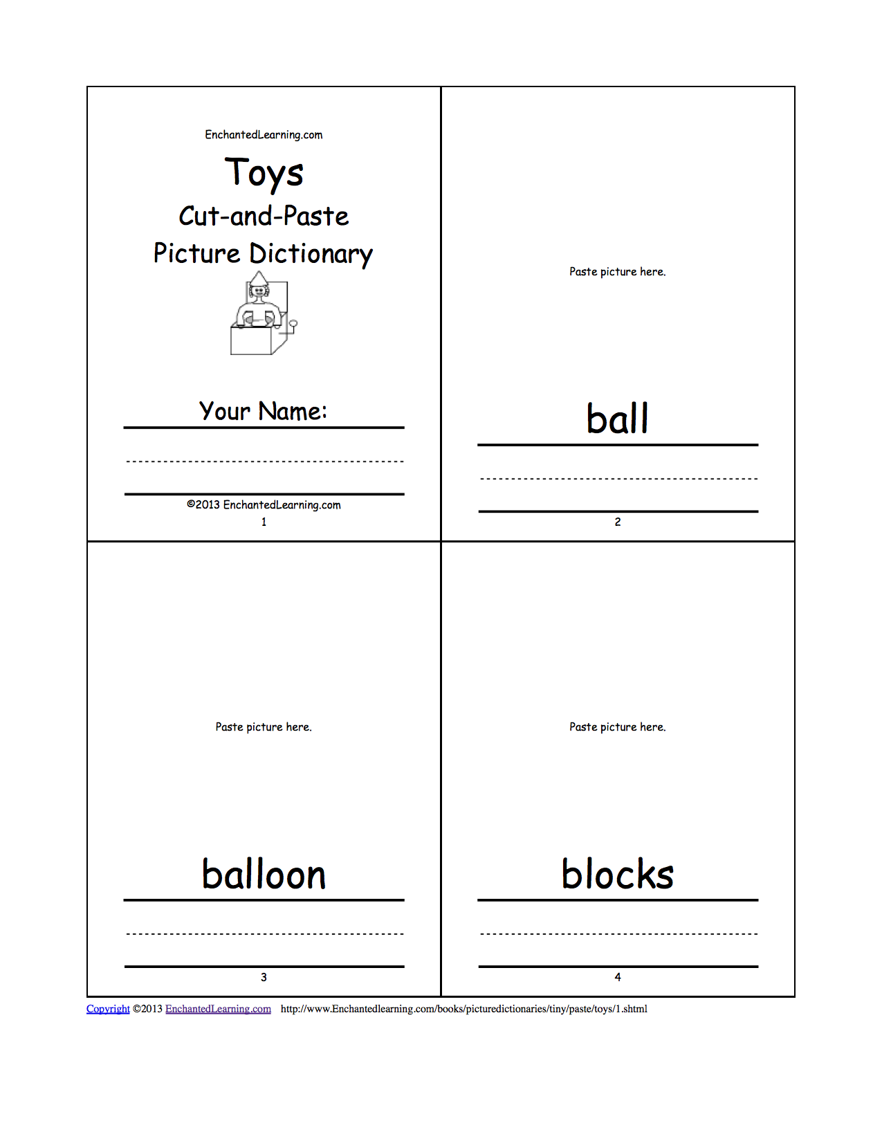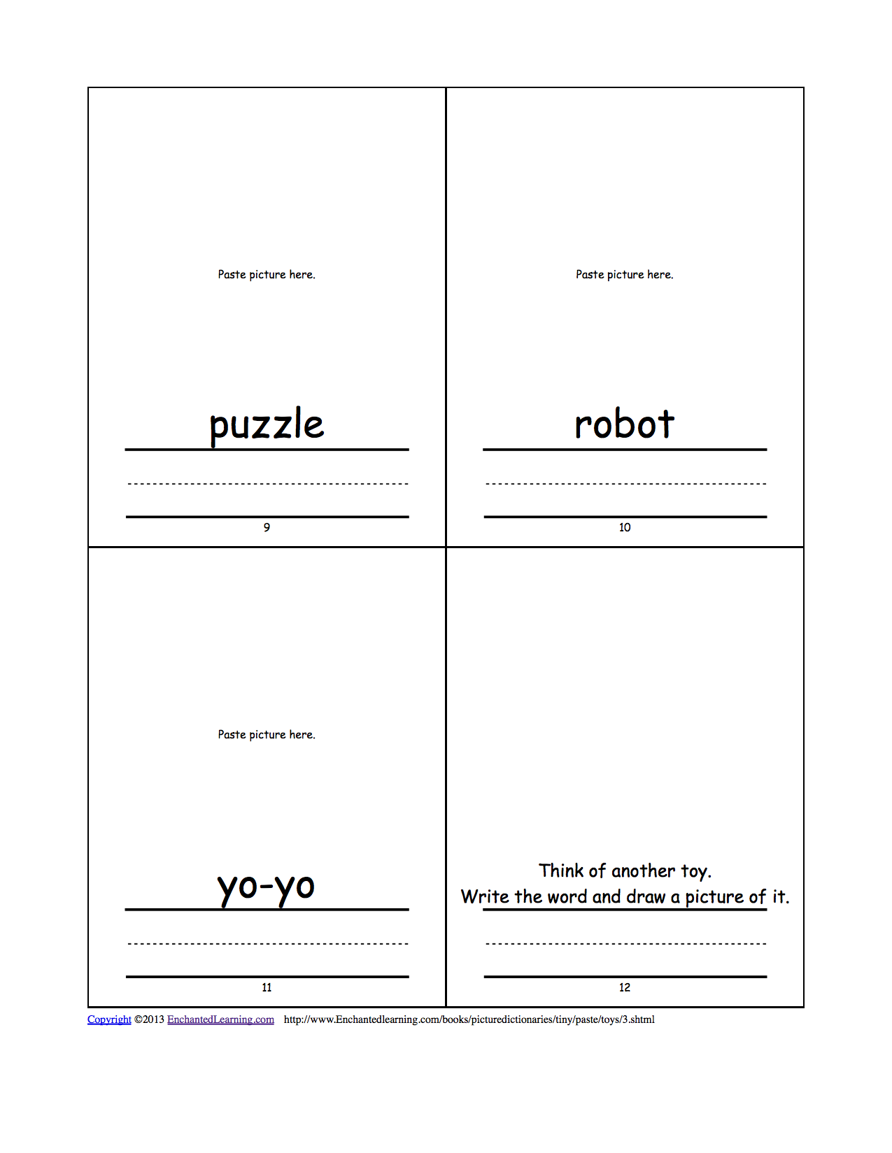 ![]() Pictures to Paste Color the pictures, then cut along the sold lines. Paste each picture on the correct dictionary page. Pictures: ball, balloon, blocks, crayon, doll, easel, kite, puzzle, robot, yo-yo, and write another toy. |