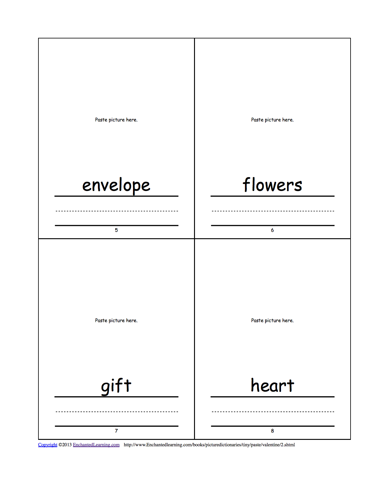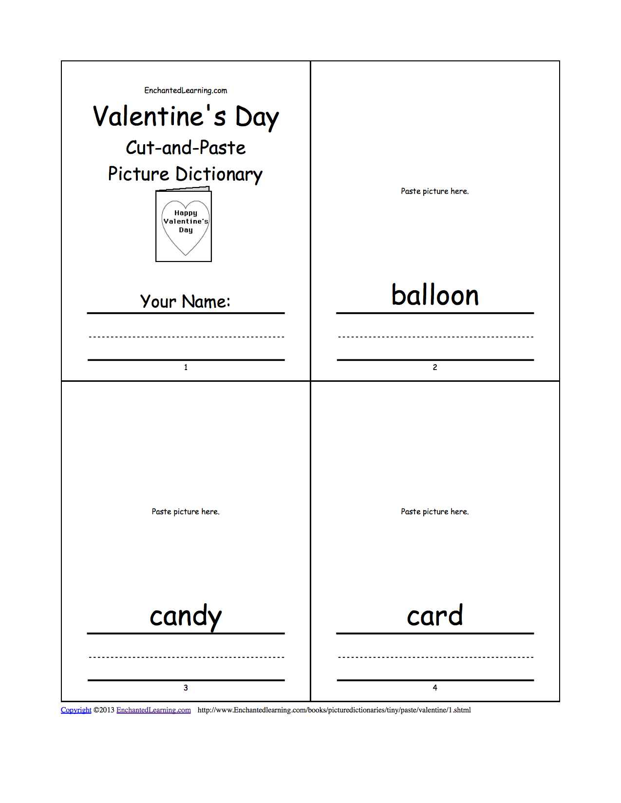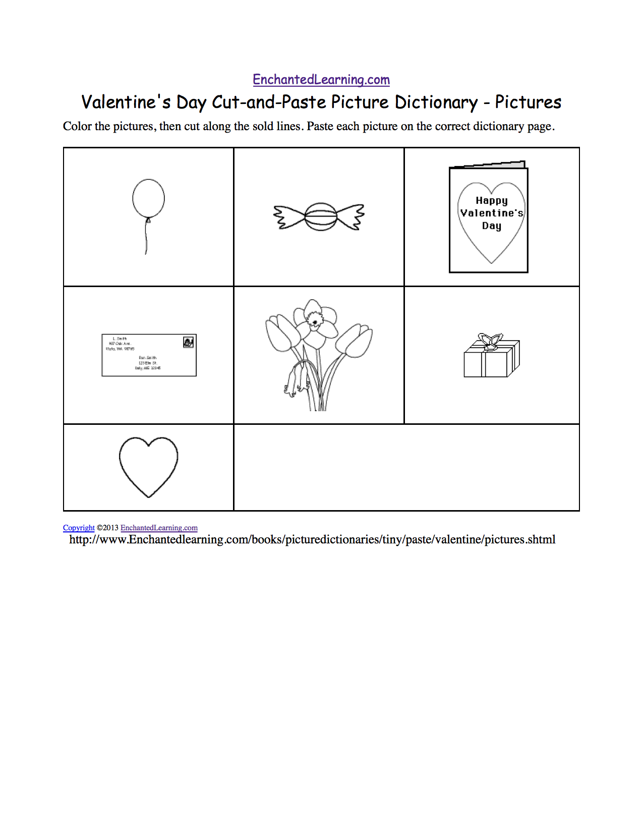 ![]() Pictures to Paste Color the pictures, then cut along the sold lines. Paste each picture on the correct dictionary page. Pictures: balloon, candy, card, envelope, flowers, gift, heart. |