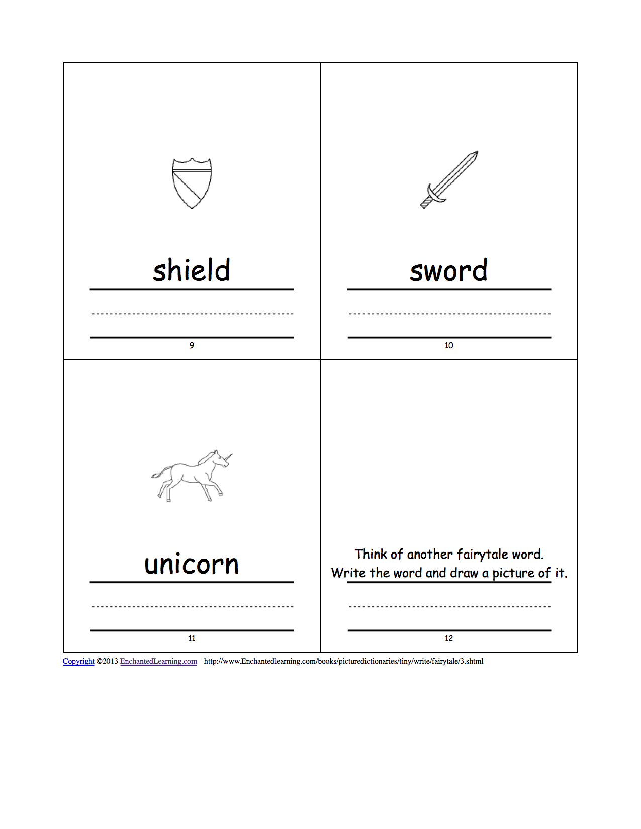 ![]() Pages 9-12 Words: shield, sword, unicorn, and write another fairytale word. |