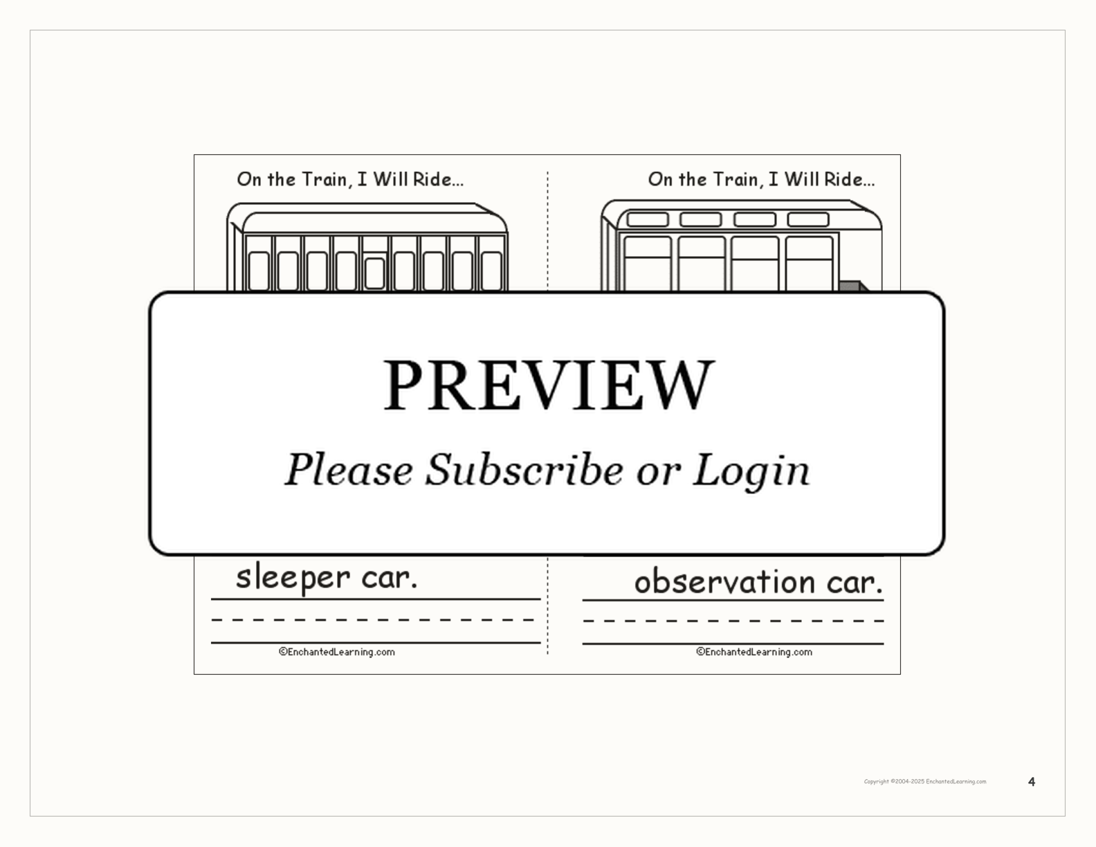 Print a short book about riding on a train and colors (for early readers). The student copies a sentence and colors a train car.