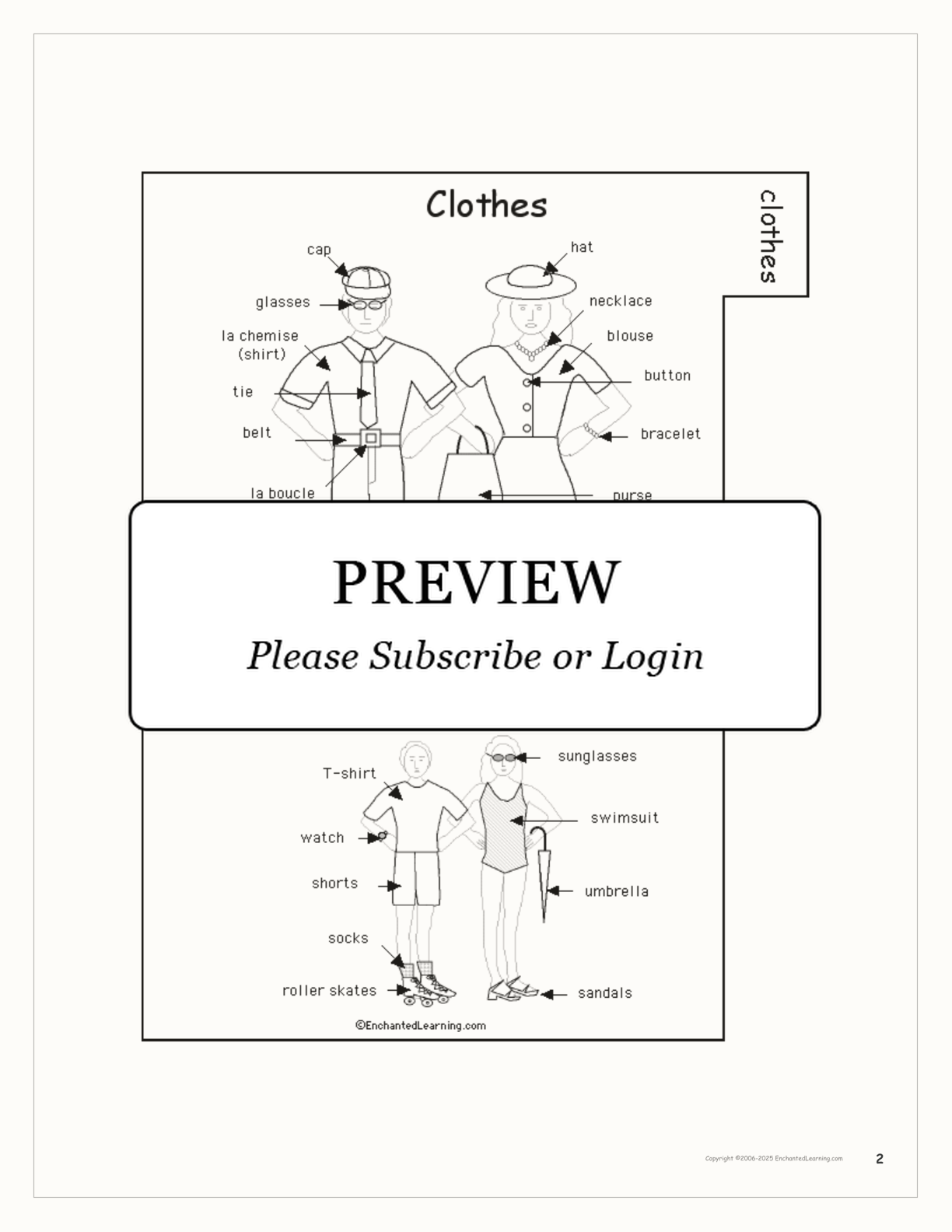 - Common clothing in English, including cap, glasses, shirt, tie, pants, belt, buckle, shoelaces, shoes, shirt, purse, blouse, bracelet, necklace, button, hat, shorts, T-shirt, watch, socks, roller skates, sunglasses, umbrella, sandals, and swimsuit.