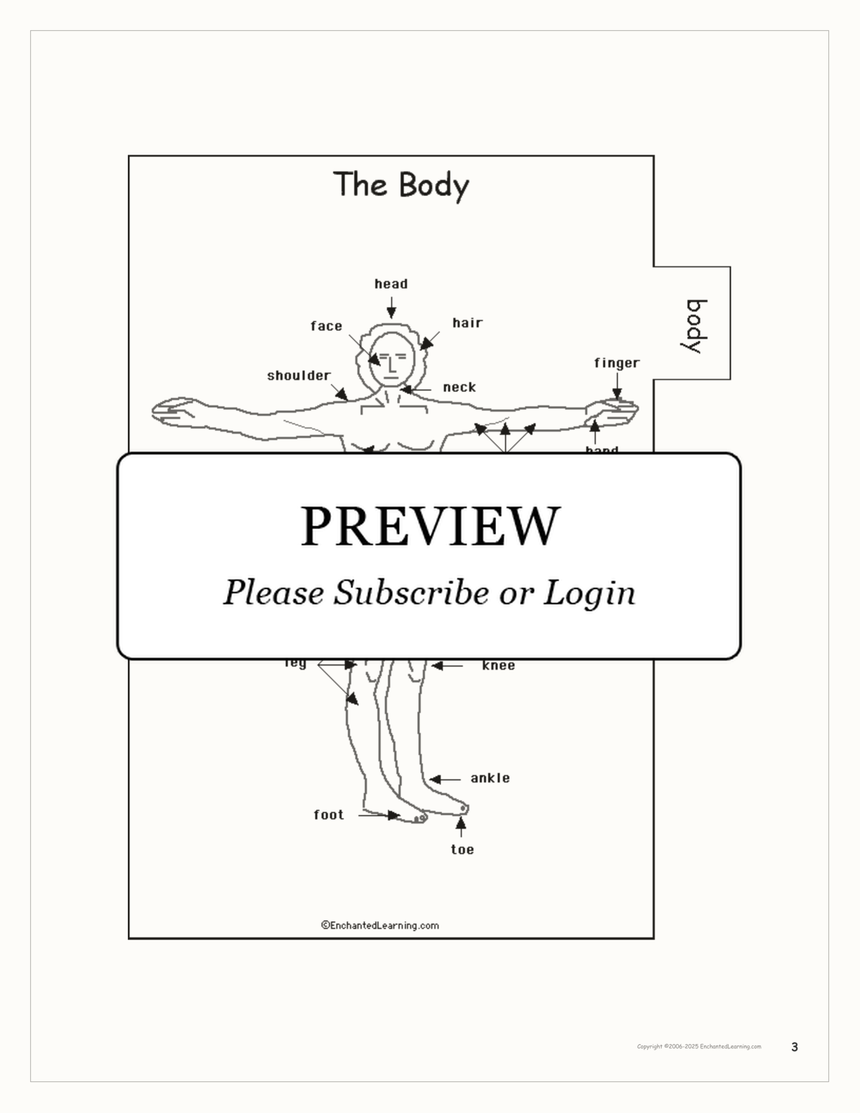 - Parts of the body, including the head, face, hair, neck, shoulder, chest, arm, hand, finger, waist, hip, leg, knee, ankle, foot, and toe.