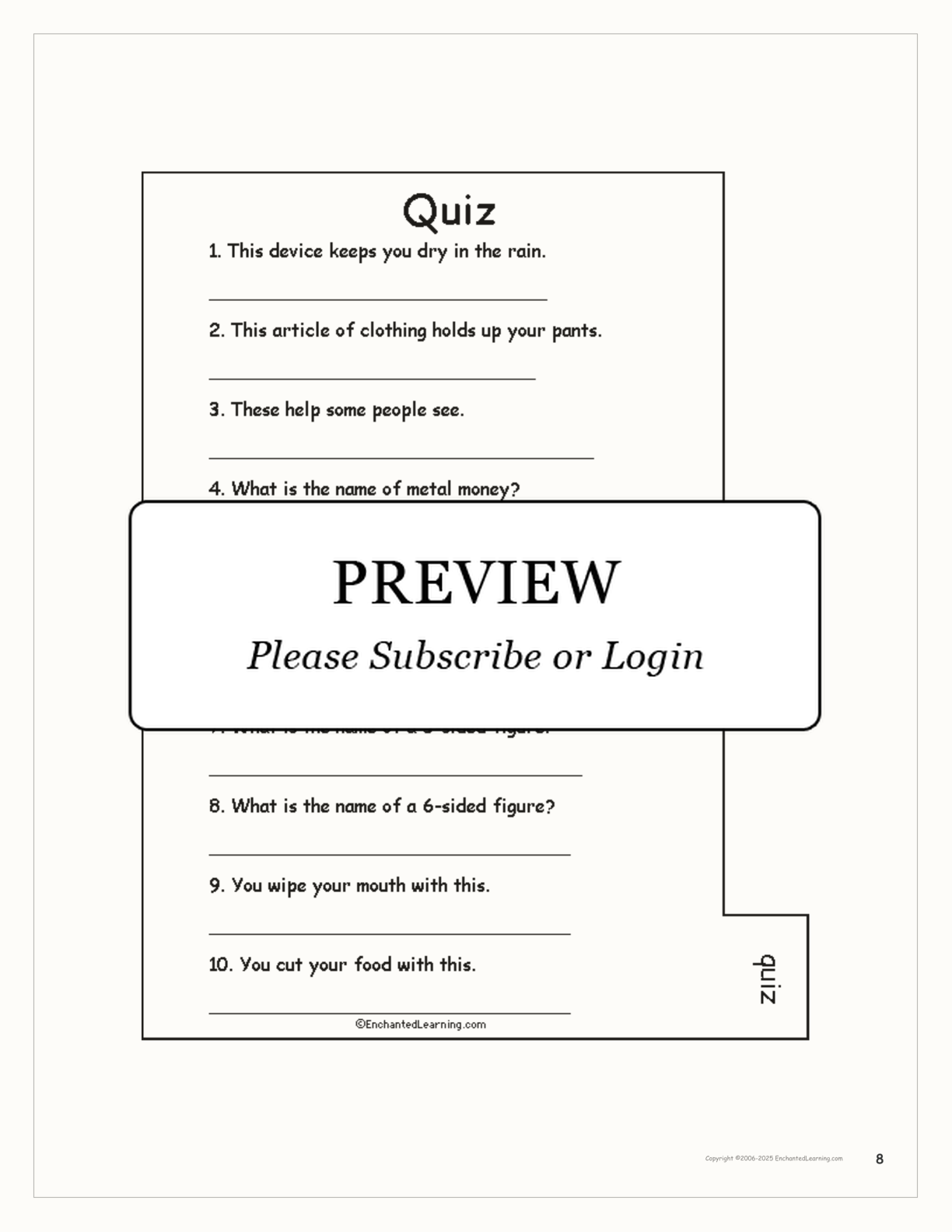 - Answer questions on words. The answers are: 1. umbrella, 2. belt, 3. glasses, 4. coins, 5. bicycle, 6. fire truck, 7. triangle, 8. hexagon, 9. napkin, 10. knife.
