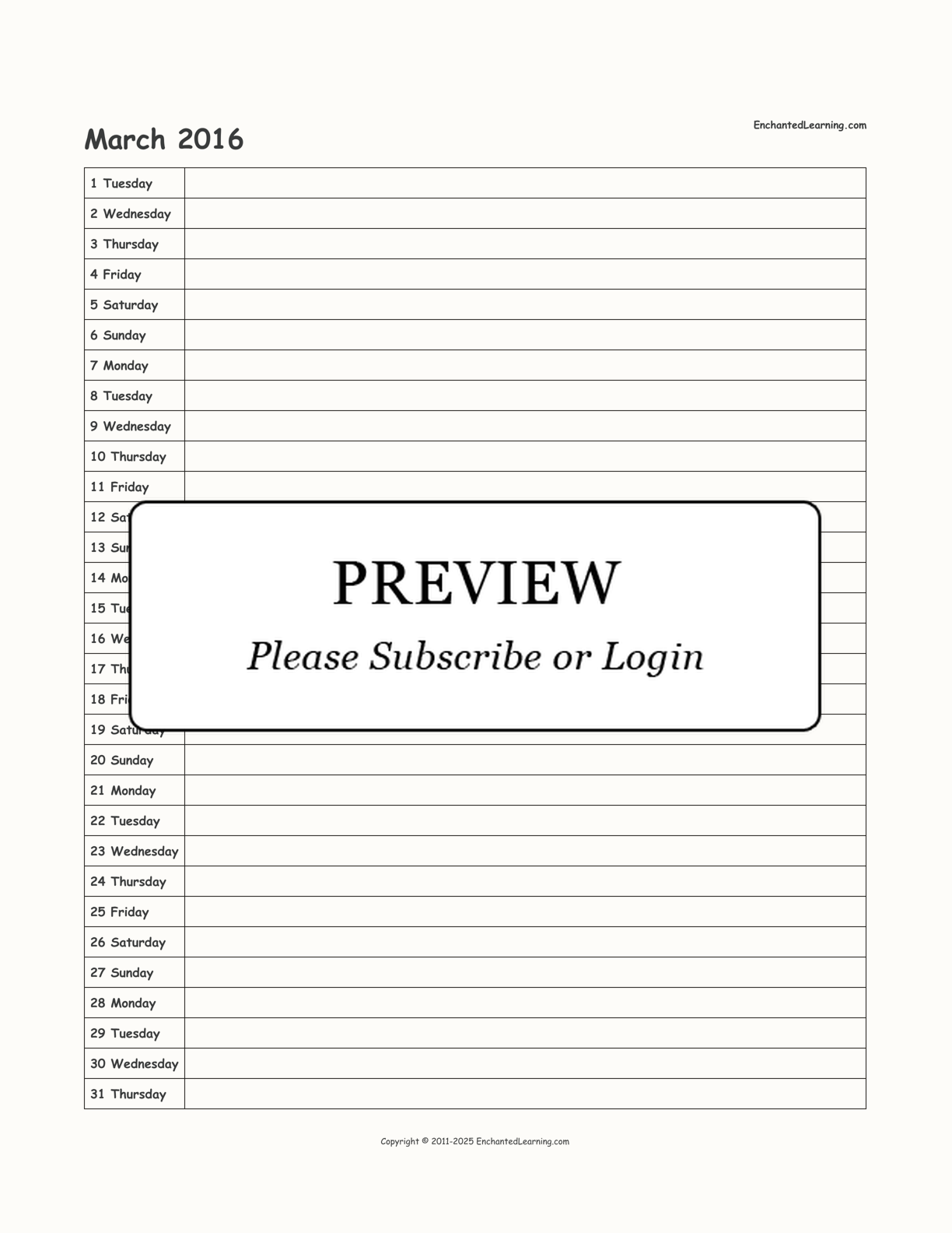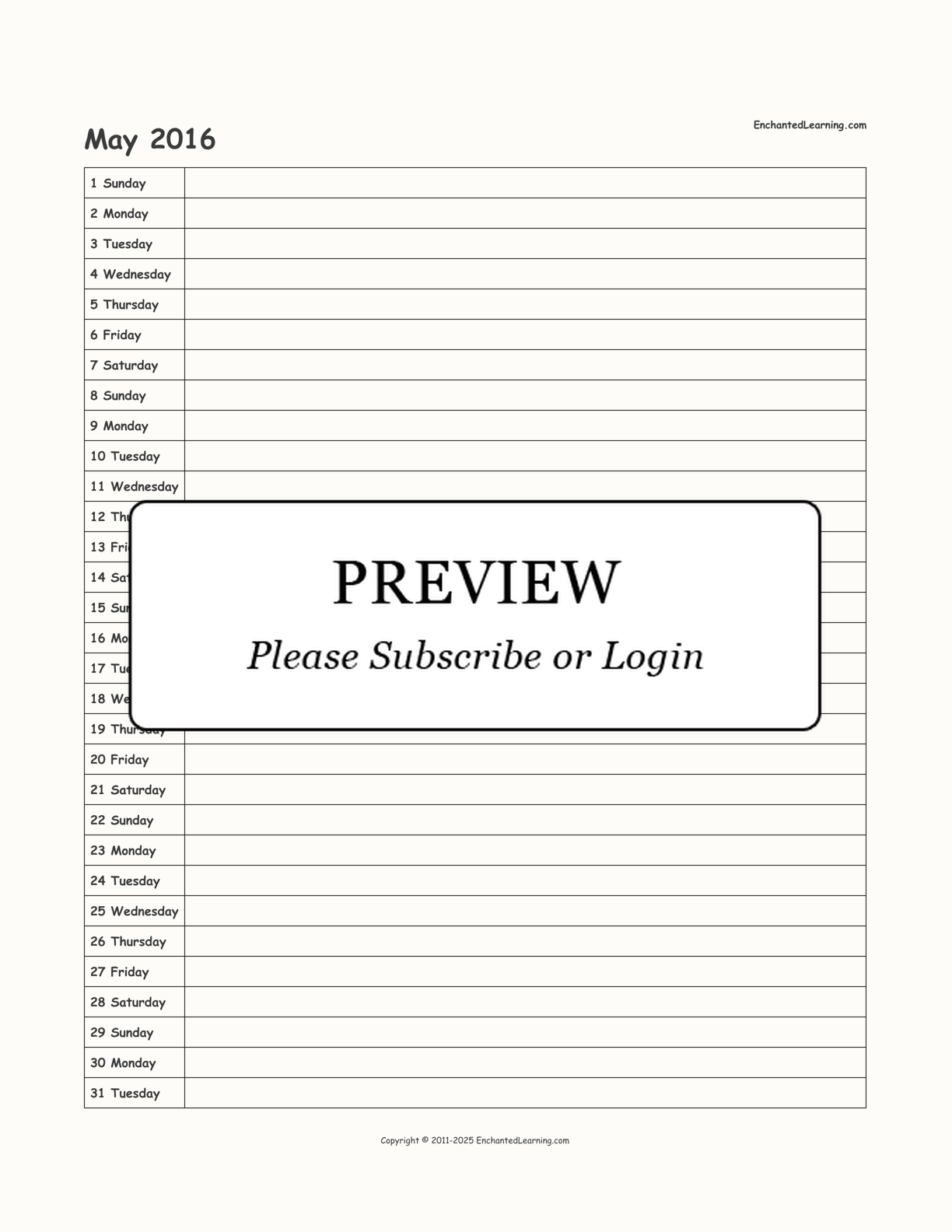 A printable scheduling calendar for 2016. Each page in the pdf contains one month and has one line per day.