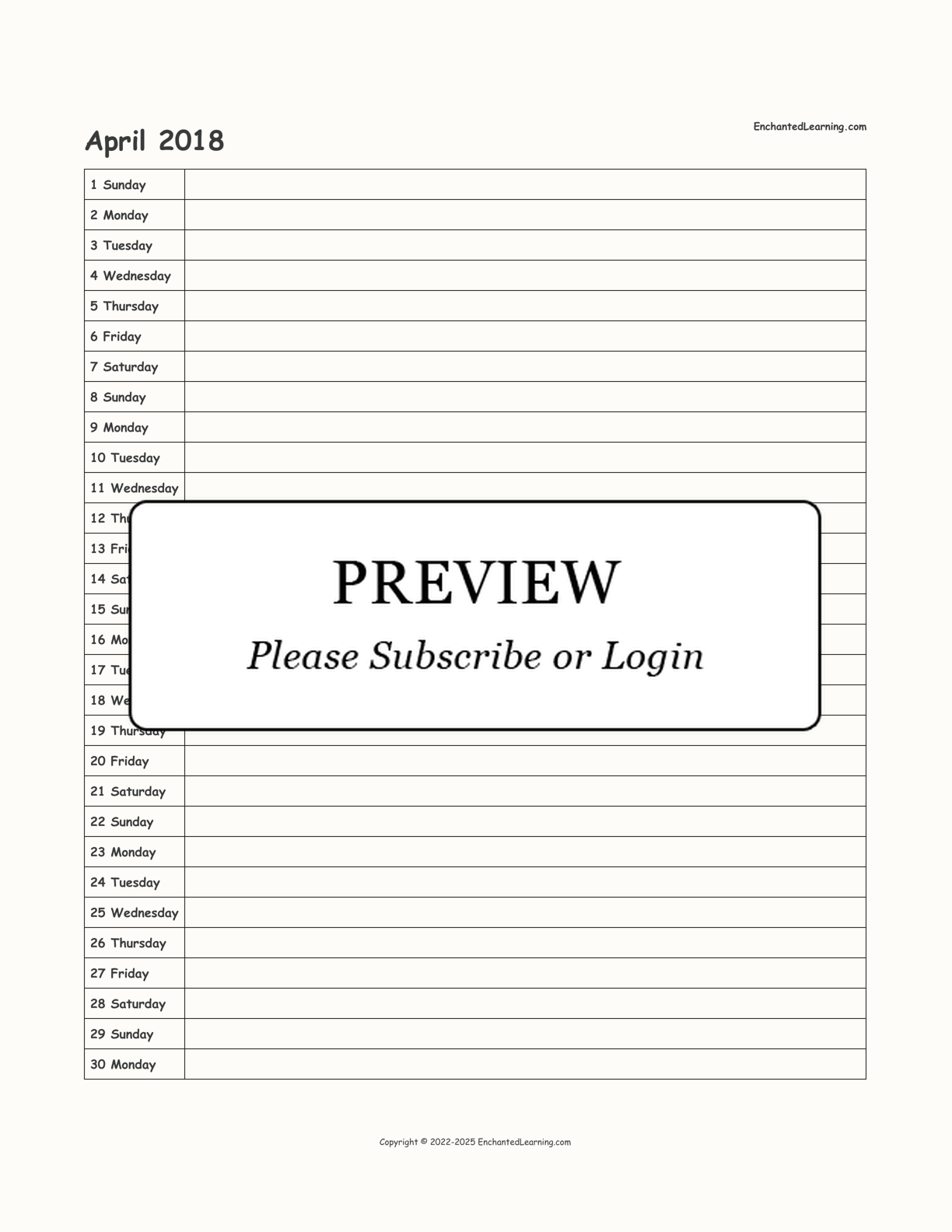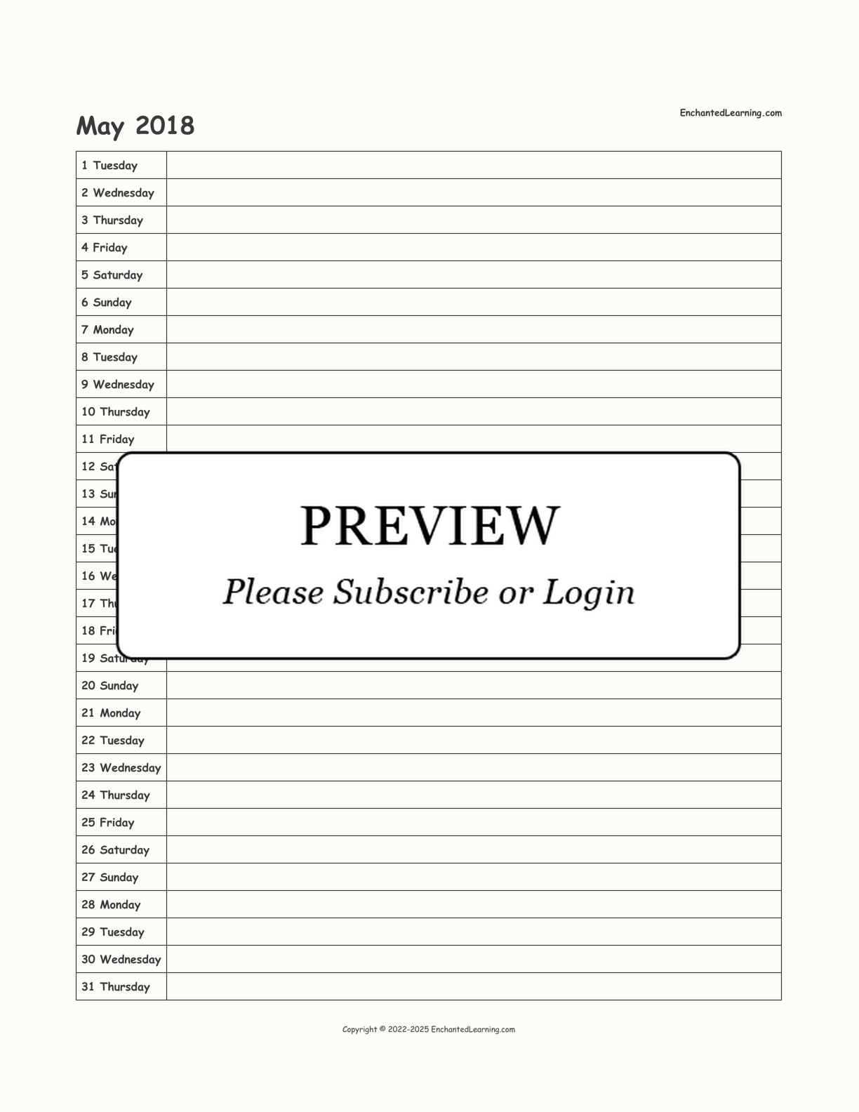 A printable scheduling calendar for 2018. Each page in the pdf contains one month and has one line per day.