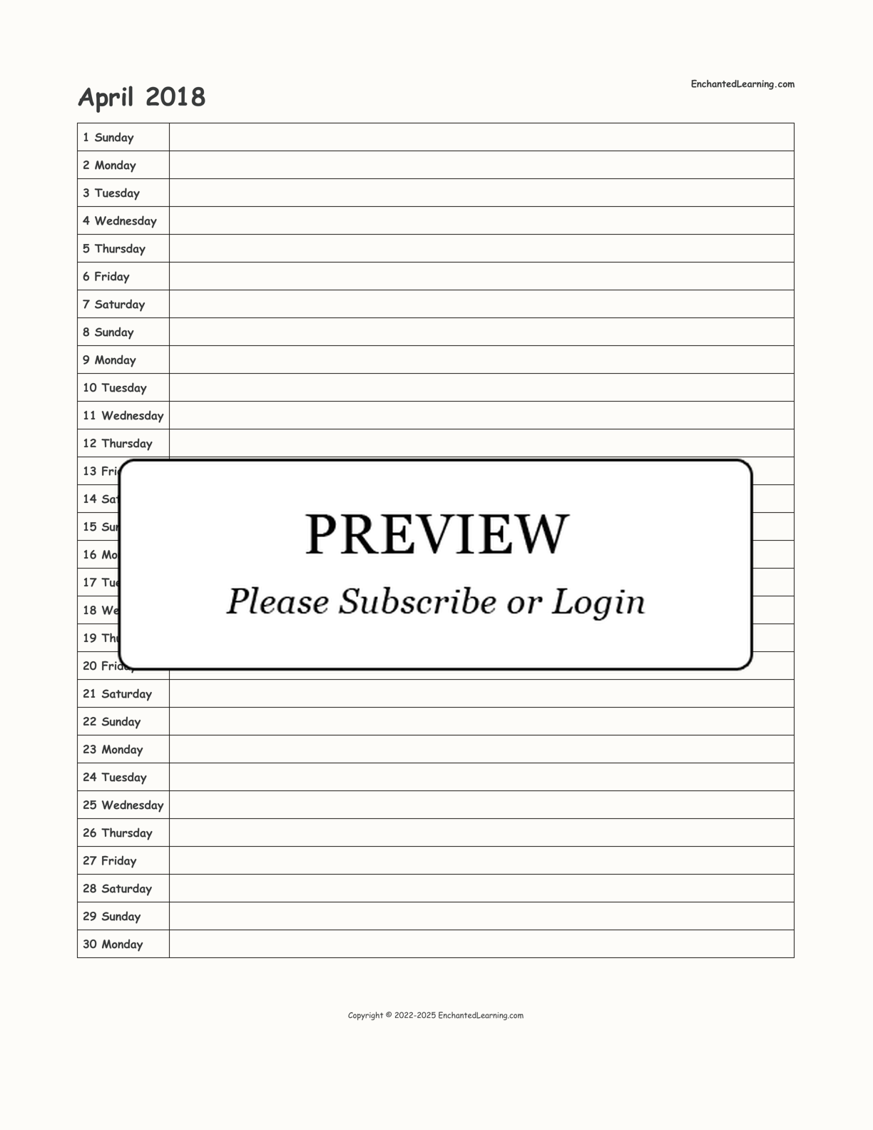 A printable scheduling calendar for April 2018 – one line per day.