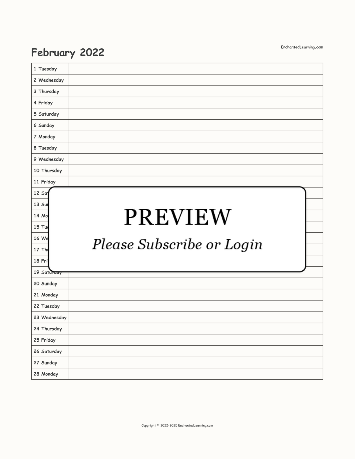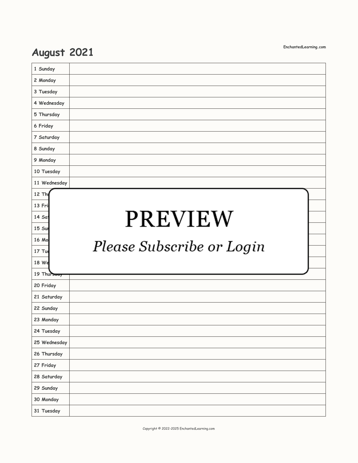 A printable scheduling calendar for the 2021-2022 school year (July to June). Each page in the pdf contains one month and has one line per day.