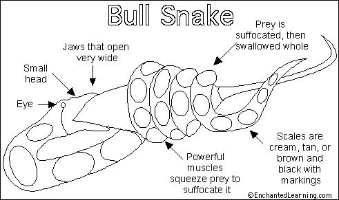 Hunting and Diet: Bull Snakes are carnivores (meat-eaters). Like all snakes, they swallow the prey whole, head first. The snake's top and bottom jaws are attached to each other with stretchy ligaments, which let the snake swallow animals that are wider than itself. Snakes don't chew their food, they digest it with very strong acids in the snake's stomach. Bull Snakes eat burrowing mammals (like mice, rabbits, gophers, and ground squirrels), ground-nesting birds, and bird eggs. After eating a large animal, the Bull Snake needs no food for a long time, and it rests for weeks.