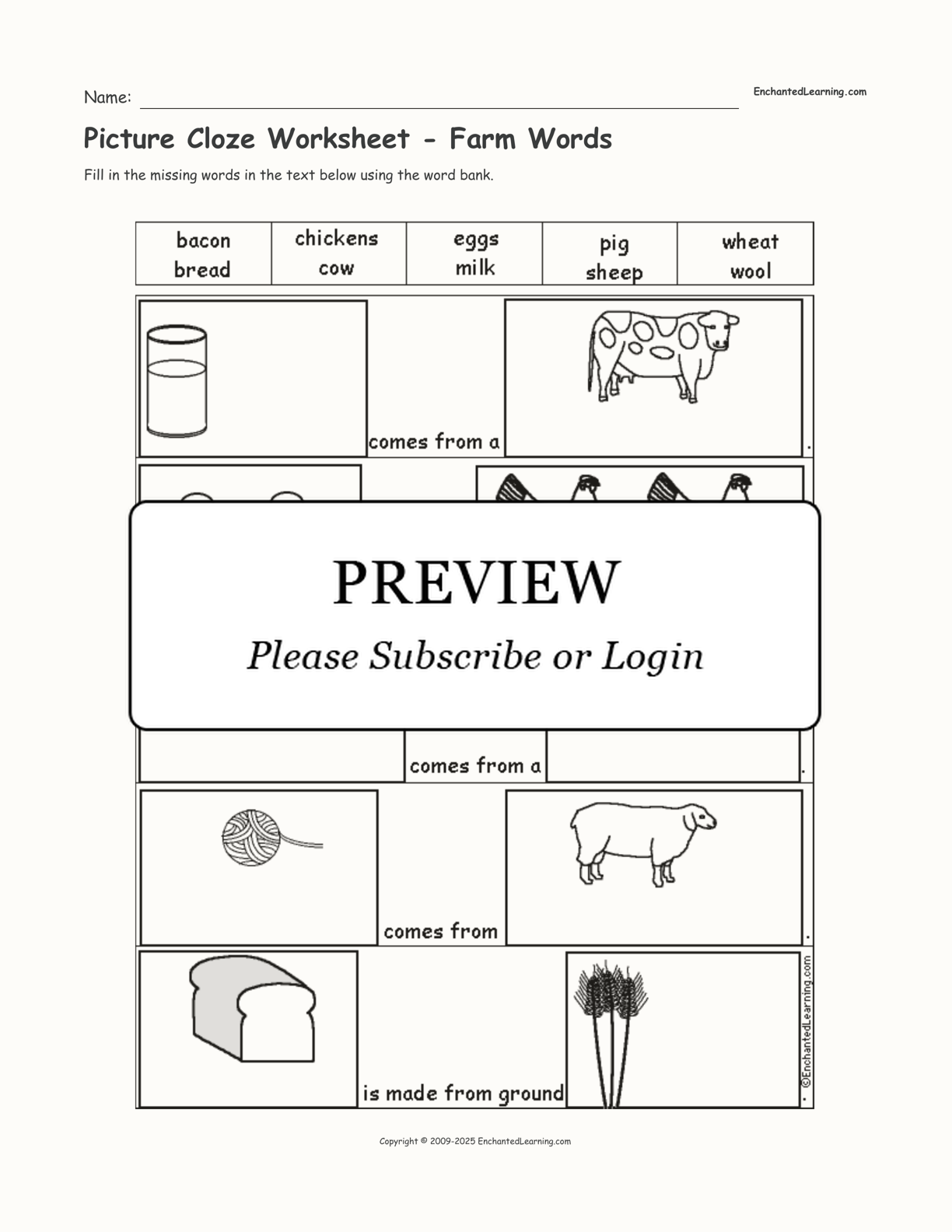 Fill in the 10 farm words using the word bank. This is a printable picture cloze worksheet.
