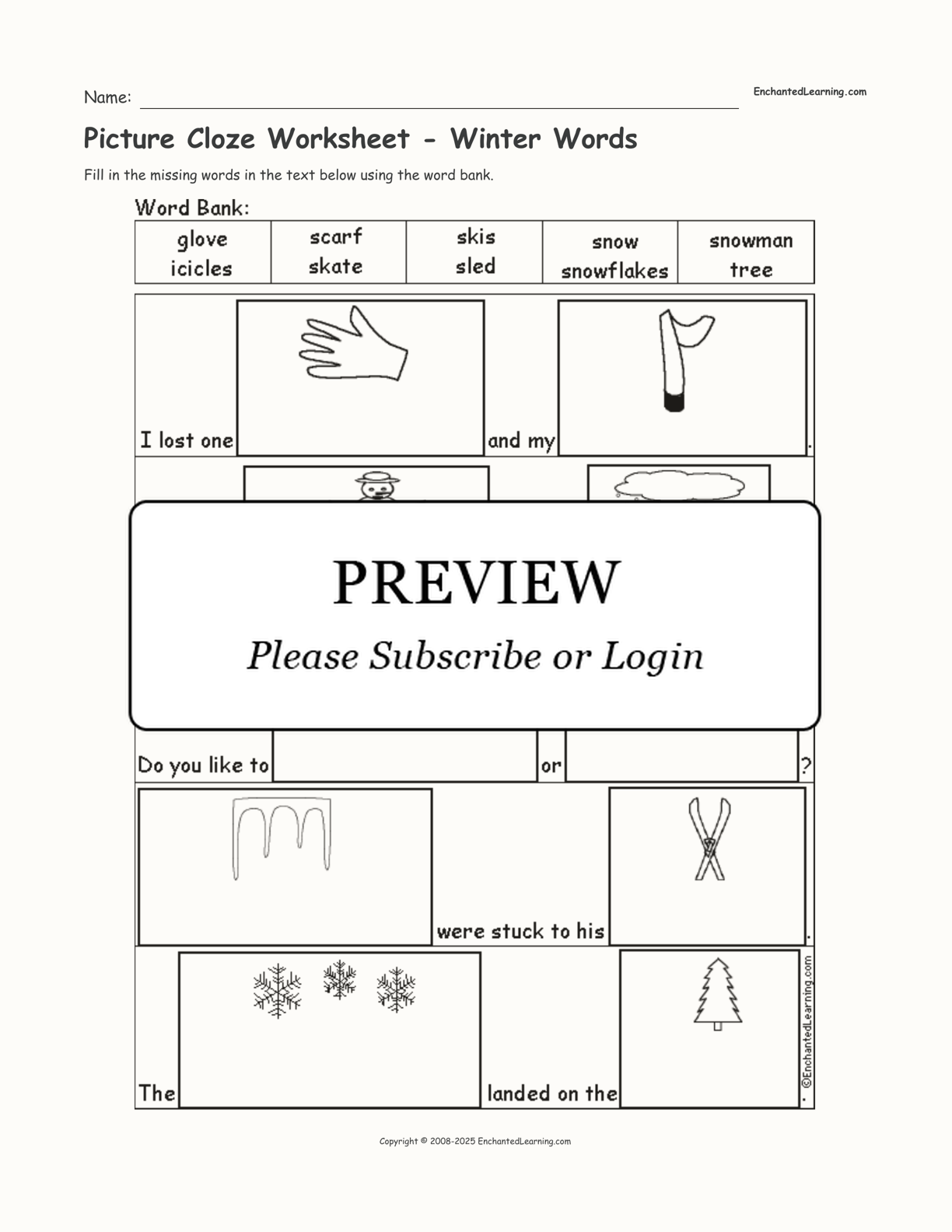 Picture Cloze Worksheet - Winter Words