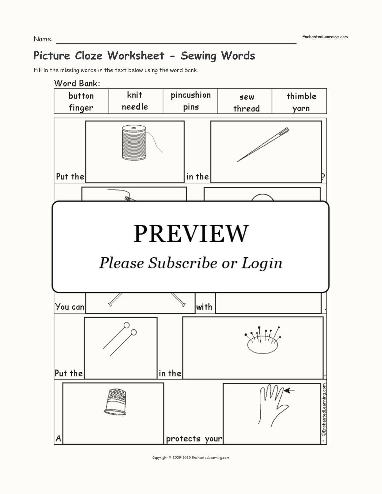Fill in the 10 sewing words using the word bank. This is a printable picture cloze worksheet.