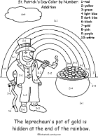 Leprechaun, Rainbow, Pot of Gold: Addition Color the leprechaun, rainbow, and pot of gold by solving simple addition problems and then coloring by number. |