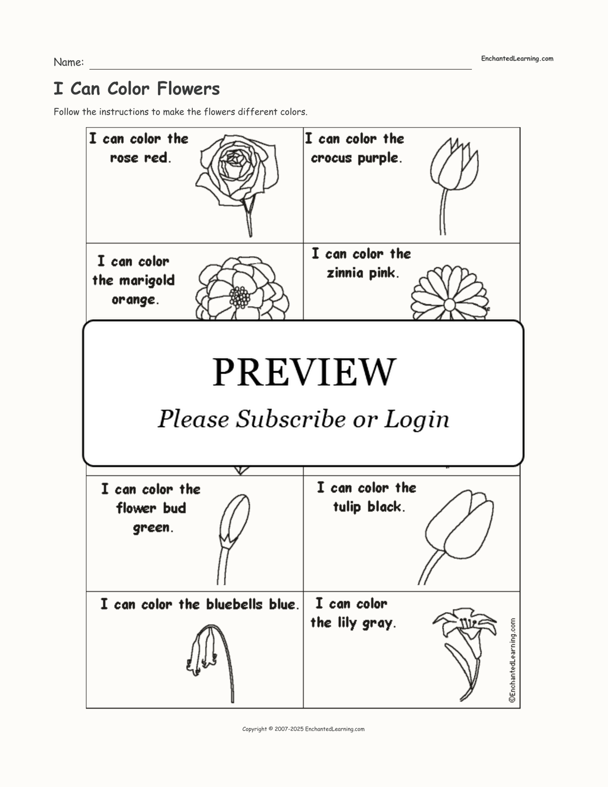 This is a printout about colors for early readers, where they follow instructions to color flowers.
