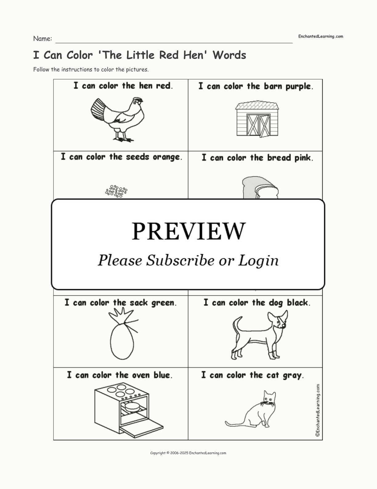 Color 'The Little Red Hen' story words in this printable worksheet for young readers.