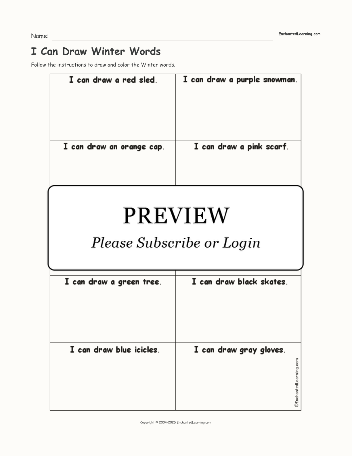 Draw and color in various winter words in this printable worksheet. Make sure to follow the instructions to know what colors to use!