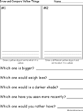 Draw and Compare Yellow Objects Draw two yellow things and then answer simple questions comparing them, for example, "Which one is bigger?" or go to a pdf version of this page. |