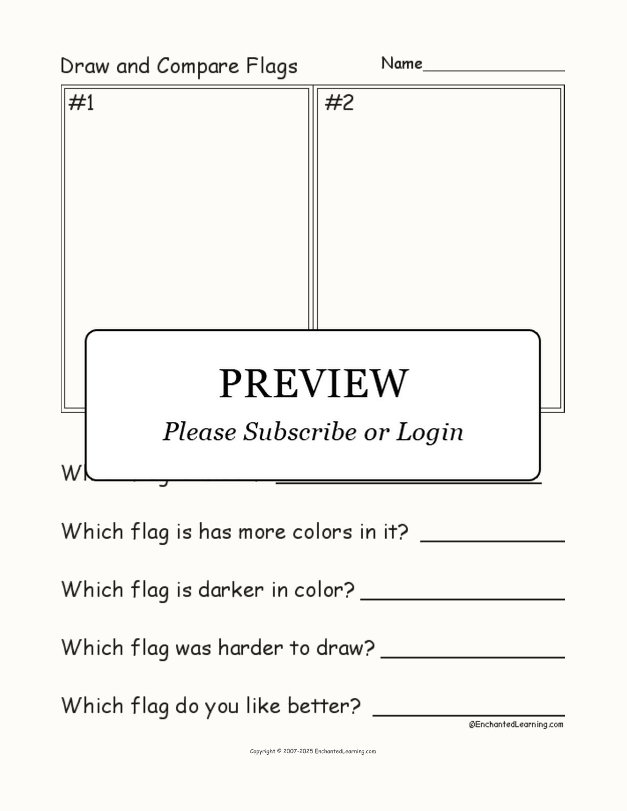 Draw two flags, write their names, then answer simple questions comparing them, like, “Which one has more colors in it?” A printout about drawing and comparing items for early readers.