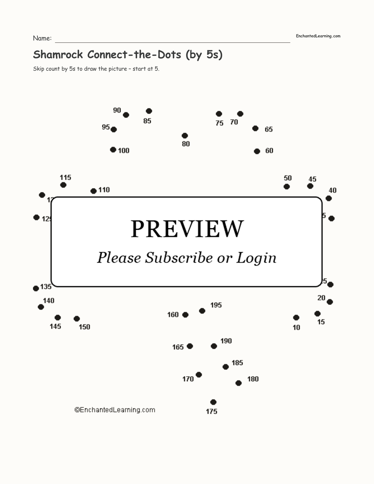 In this ‘Shamrock Connect-the-Dots’ printout, connect the numbers to draw a shamrock for St. Patrick’s Day. Skip count by 5s to draw the picture.