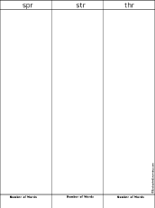 Think of and write words that start with spr, str, and thr. Then add up how many you have of each.