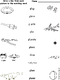 Draw lines between each word starting with “pl” and its picture.