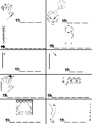 Fill in Missing Letters in Words Starting With Consonant Blends and Digraphs: TH. A printout about consonant blends for early readers: thumb, think, thermometer, thermos, thick, thin, thimble, thousand, theater, thigh.