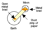 Connect one end of the short (roughly 4-5” long) strip of paper to the center of the back of the Moon using a brad.