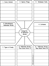 In this printable worksheet, write Halloween words by category (scary animals, spooky things, Halloween verbs, costumes, candies, etc.).
