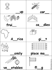Missing Letters in Kwanzaa Words Find the missing lettters in Kwanzaa words, and then color the picture of the word. The words are cup, corn, fruit, candles, Africa, gift, family, place mat, vegetables, and flag. |
