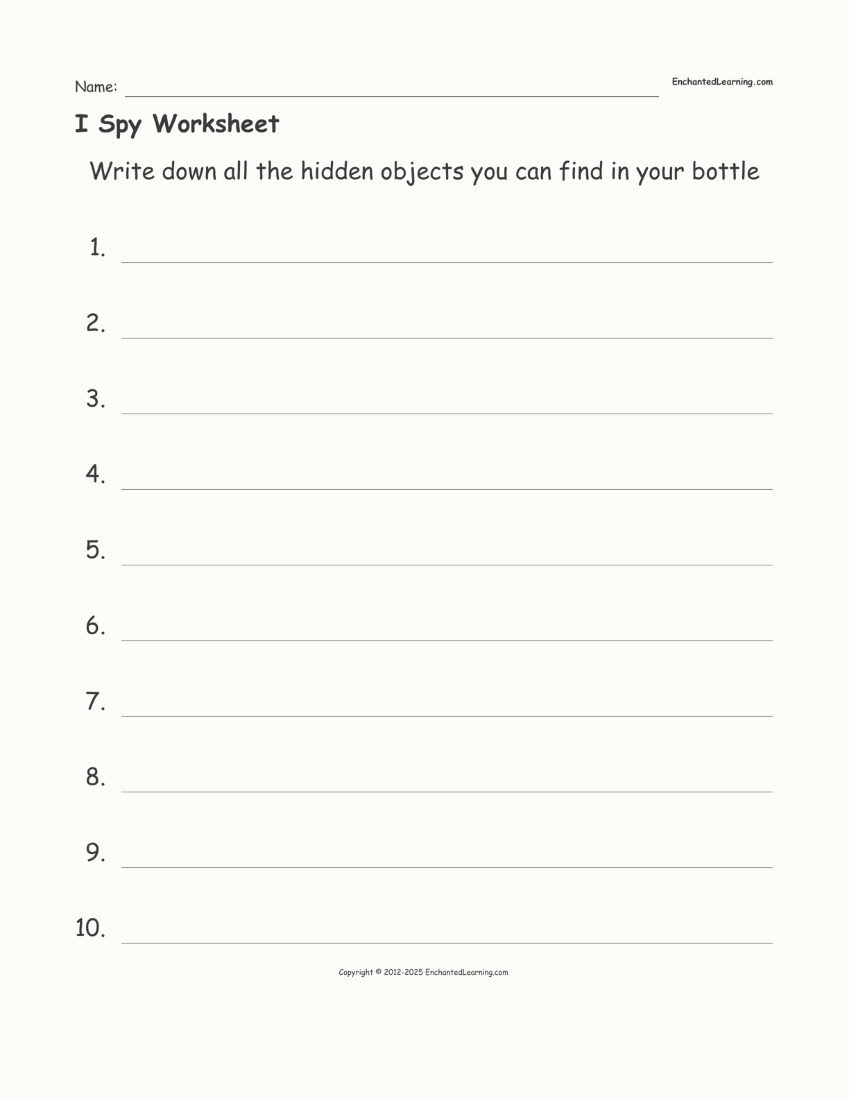 After doing the I Spy Sand bottl craft, write down all the hidden objects you can find in your bottle.