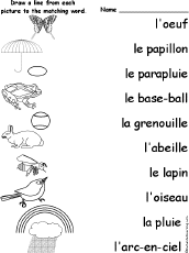 Match 10 Spring words to their pictures. The words are: l’oeuf/egg, le papillon/butterfly, le parapluie/umbrella, le base-ball/baseball, la grenouille/frog, l’abeille/bee, le lapin/rabbit, l’oiseau/bird, la pluie/rain, l’arc-en-ciel/rainbow. Or go to the answers.