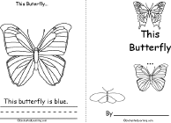 A short printable book for early readers about colors. The pages are: This butterfly is blue, yellow, red, pink, purple, orange, green, brown, gray, stripes, and dots.