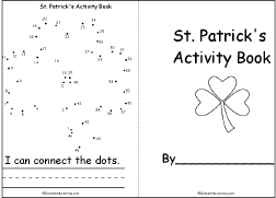 A St. Patrick's Day activity book for early readers with connect the dots, color by number, a maze, fill in the missing letters, match the shamrocks, finish the drawing, and a word unscramble.