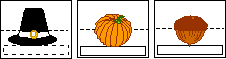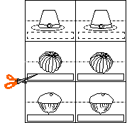 This step is for an adult. Using a small scissors or a craft knife, carefully cut along the top half of the Pilgrim hat, pumpkin, and acorn. The place to cut is marked in red in the picture to the left.