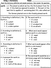 Earth Definition - Multiple Choice Comprehension Quiz Answer 8 multiple-choice questions on the definition of earth; a lesson in using a dictionary. Go to the answers. |