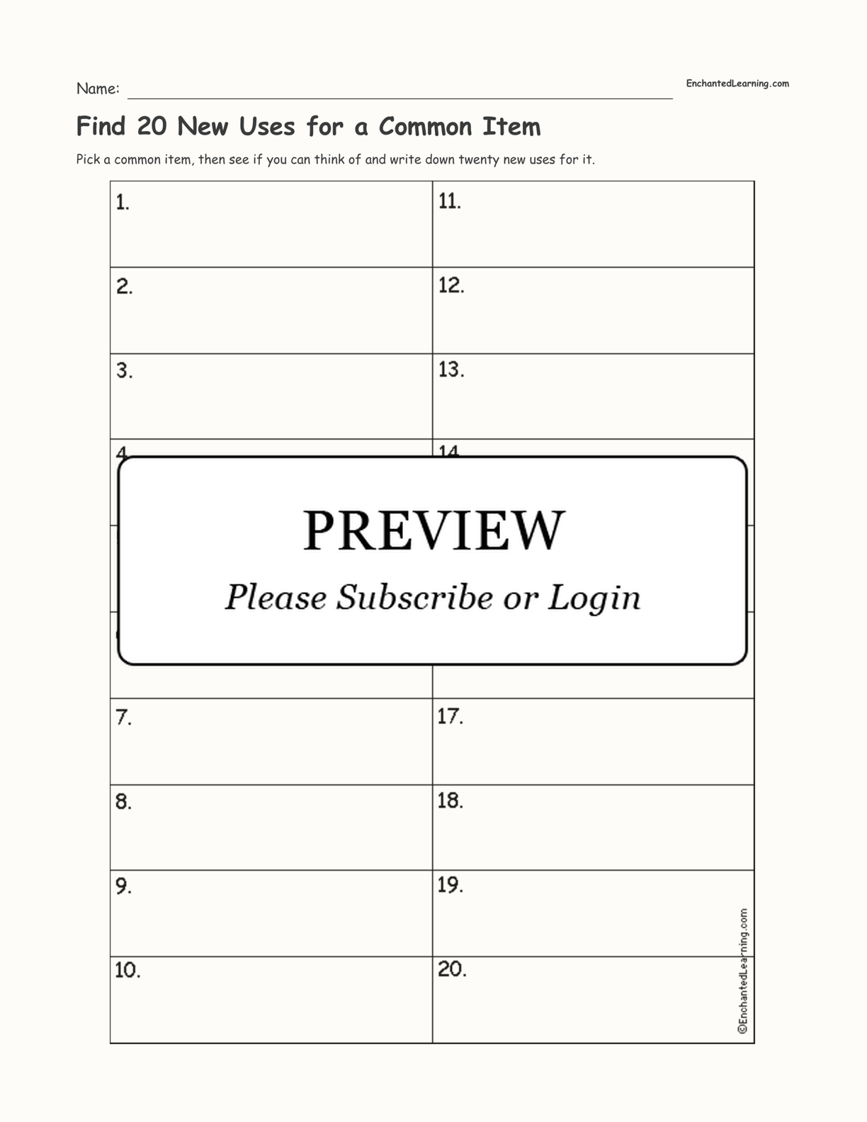 Pick a common item, then see if you can think of and write down twenty new uses for it.