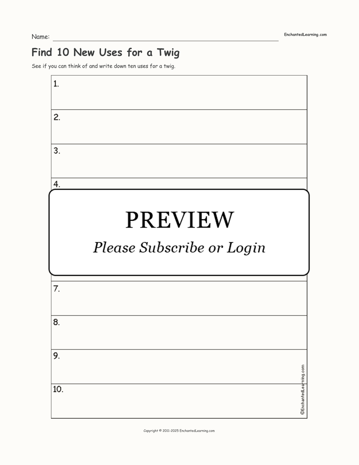 See if you can think of and write down ten uses for a twig in this printable worksheet.
