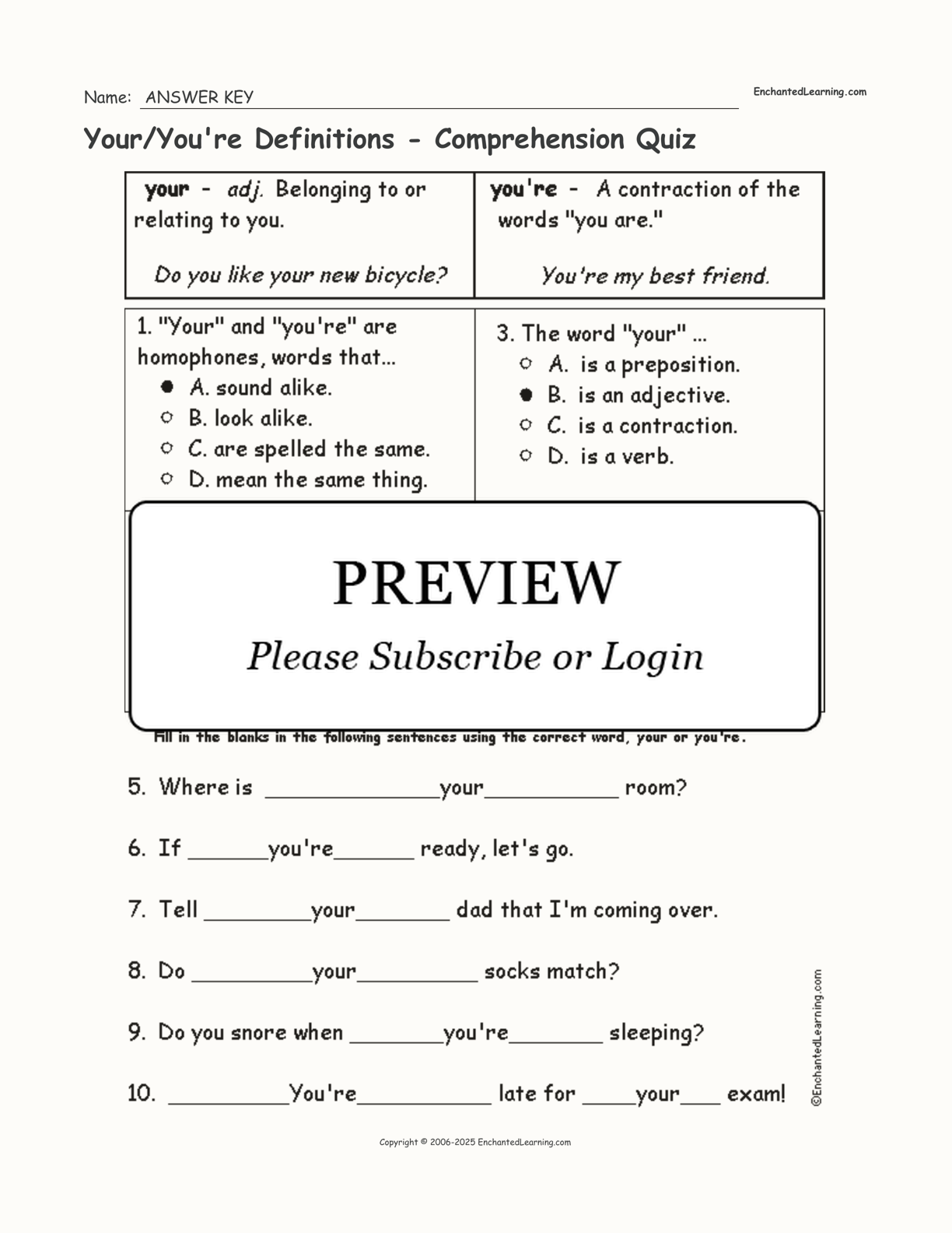A printable comprehension quiz about the words "your" and "you're". Practice using these commonly misused words.